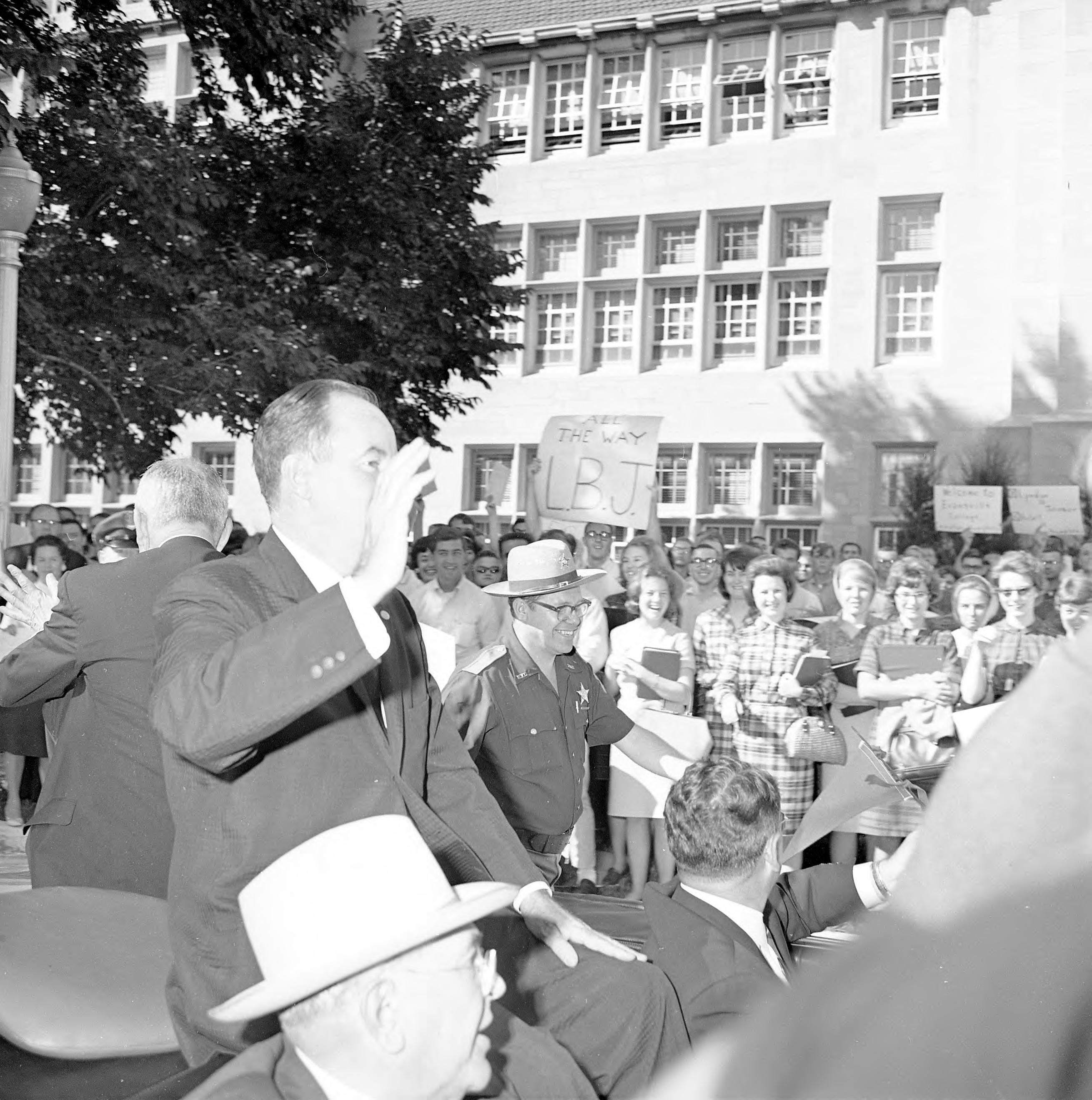In 1964 then Senator Hubert Humphrey was in Evansville as the vice-presidential nominee on the ticket with Lyndon B. Johnson for president. One of his unscheduled stops was at Evansville College (now University of Evansville) at 1800 Lincoln Ave. In front of him, just by his hand, is Indiana Senator Vance Hartke. The man partially visible in the foreground is Indiana 8th district Congressman Winfield Denton.