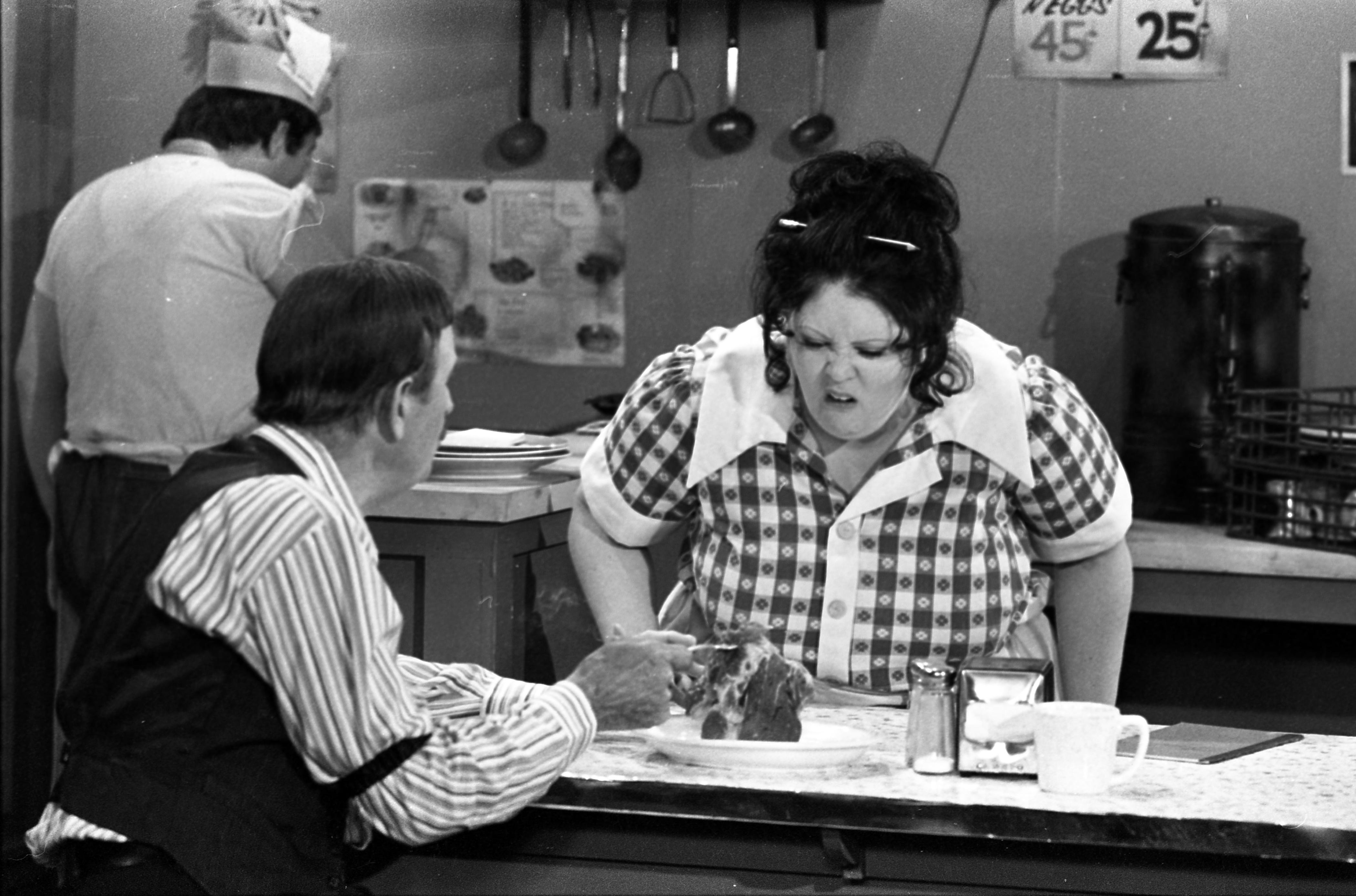 Evansville Courier photographer Sonny Brown was a friend of Hee Haw cast member Grandpa Jones, who was born in Niagara, KY (in Henderson County---just across the river from Evansville, IN) and thus was able to visit the set and take lots of backstage photographs. Here are Lulu Roman, Archie Campbell, and an unknown actor.