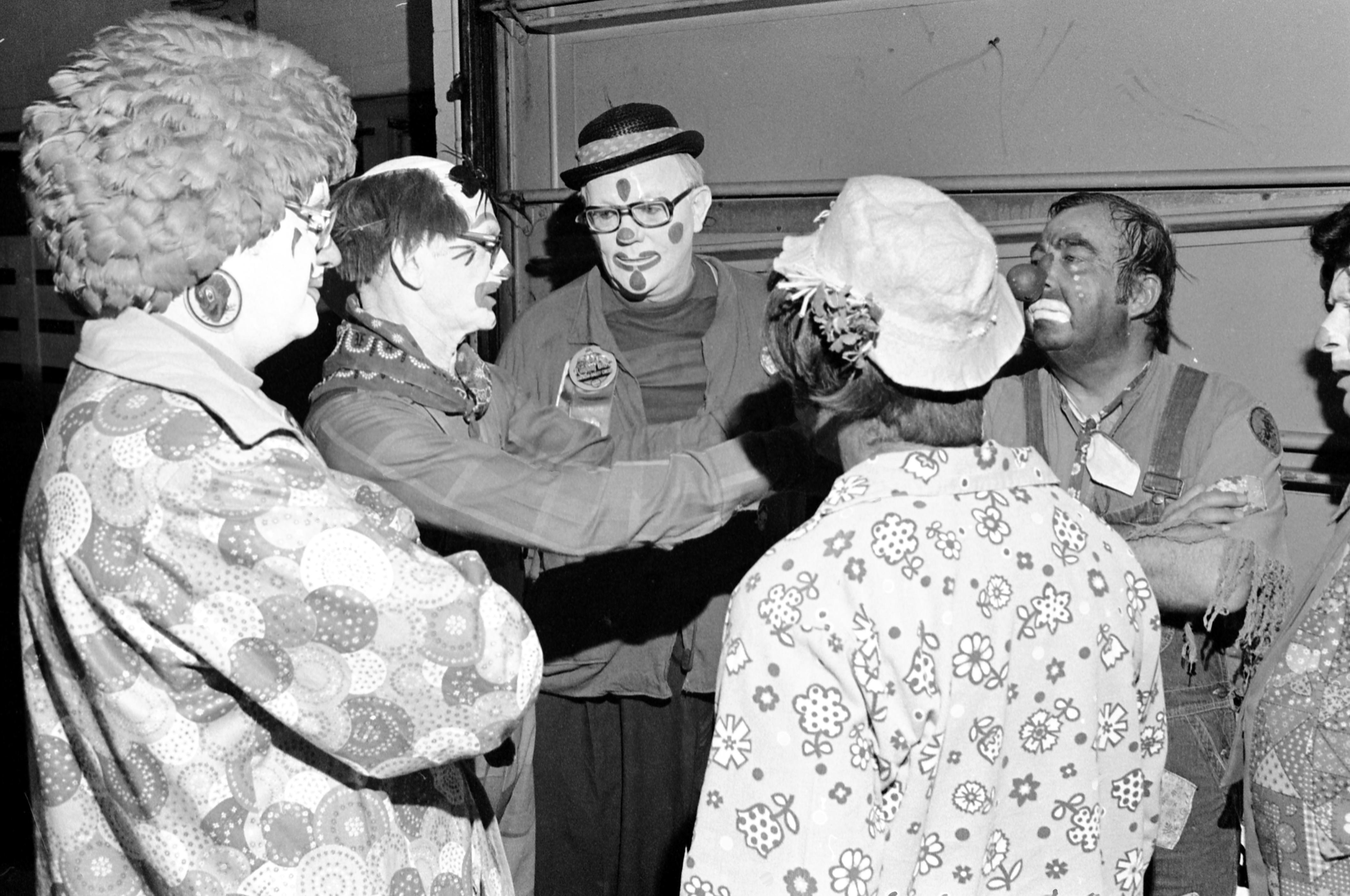 Six Hadi Shrine Circus clowns backstage, having a discussion