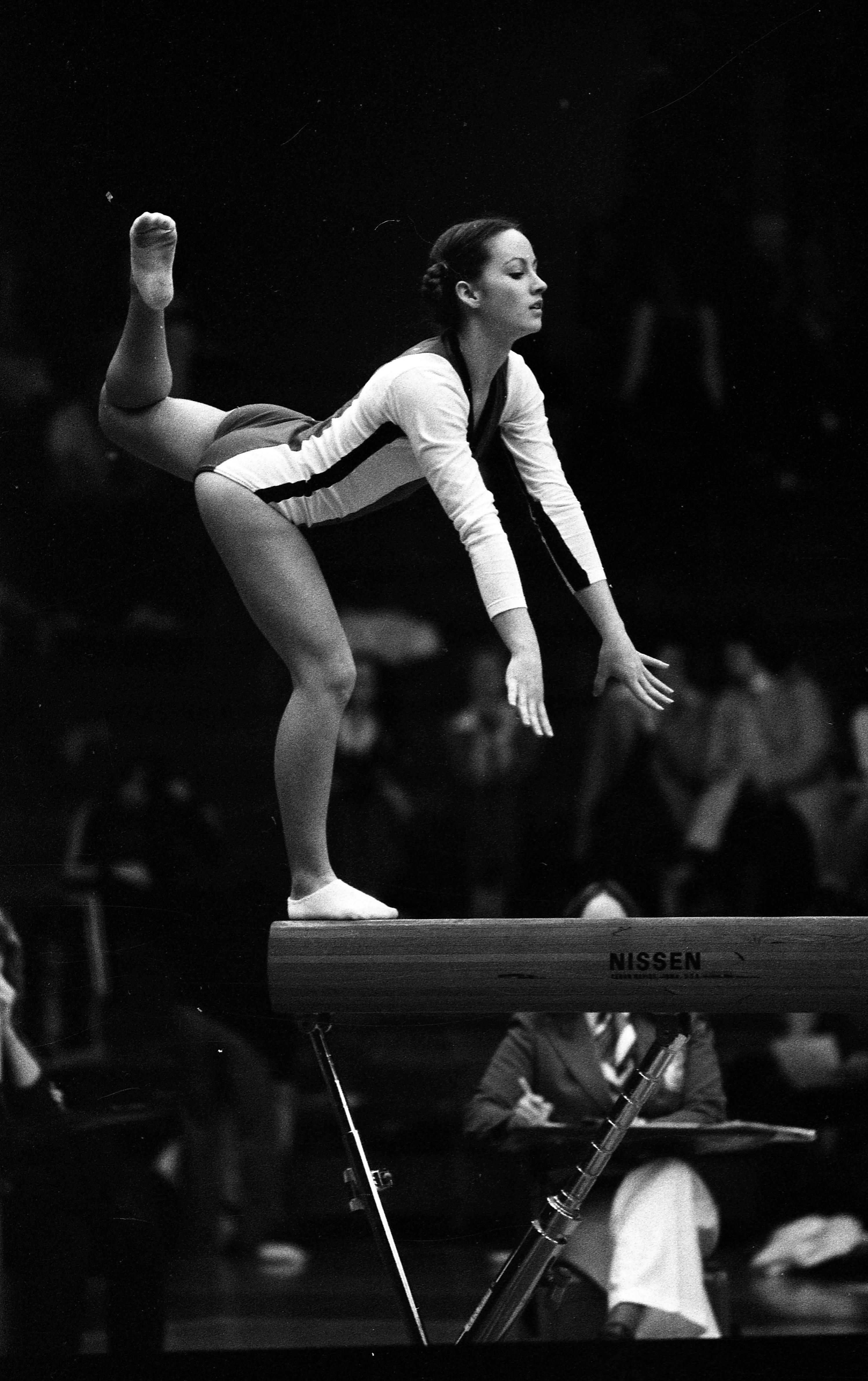 Girl standing on one foot on a balance beam