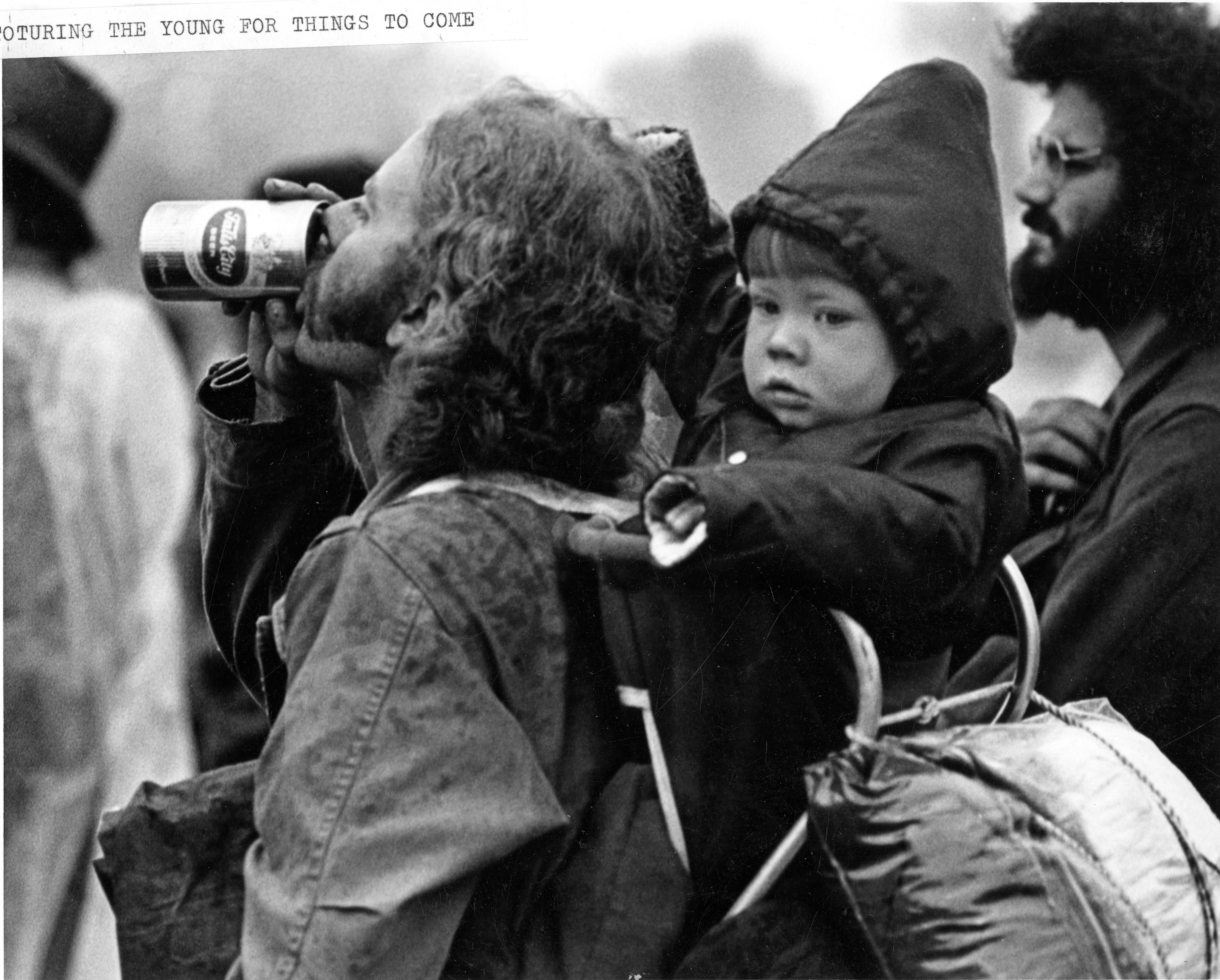 Over the Labor Day weekend in 1972, 2 promoters planned to hold a rock music festival on the grounds of a racetrack in Chandler, Indiana, billed as the Erie Canal Soda Pop Festival. Indiana officials prohibited the use of the initial site, forcing promoters to a last minute move to Bull Island, a piece of land jutting out into the Wabash River. Only accessible from Indiana, Bull Island was east of the river, but through a technicality based on the original course of the river, it was officially in Illinois' jurisdiction. (Bull Island is how this festival is most commonly known.) Expected crowds of 55,000 swelled to 200,000 to 300,000. Law enforcement (only 3 deputy sheriffs were on scene), access (cars were parked for 4 miles along the interstate as drivers and passengers then hiked in), sanitation, food, and water were completely inadequate. Many of the promised performers did not show. Sex, drugs, and rock and roll was the order of the day. A torrential rainstorm furthered the chaos; the event ended withn 2 deaths, overturned and robbed food trucks, the stage being burned, mounds of debris, and massive legal problems for the 2 promoters. A typewritten caption on this photograph says,""Toturing [tutoring?] the young for things to come."