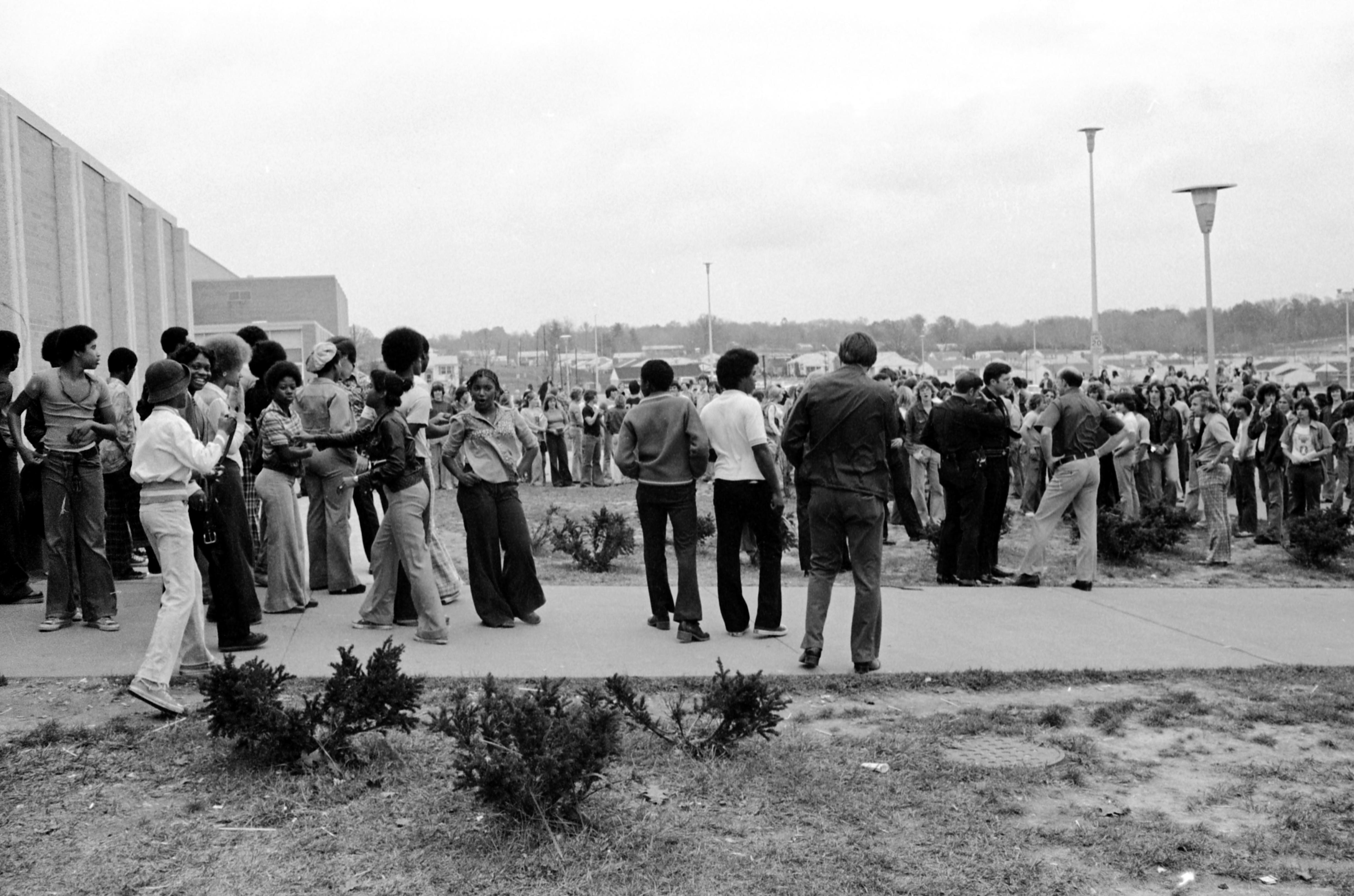 Large group of students outside Central High School (5400 N. First Ave.) with several police officers because of a fight. Nine students were arrested after a racial confrontation.