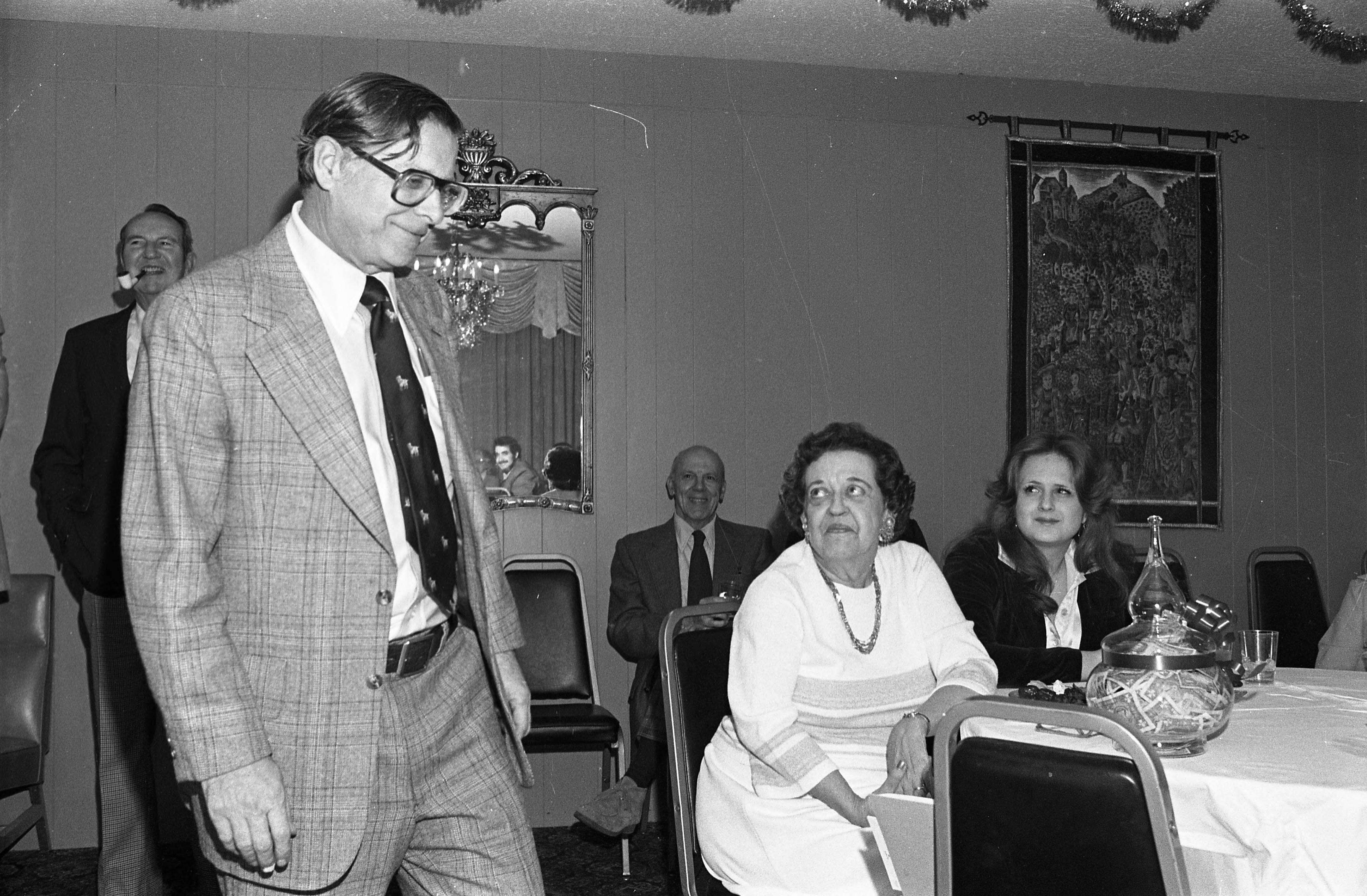 Three women at a table at an event, watching a man they have been talking to walk away. There is a decorative glass jar full of $1 bills on the table, so this could be a fundraising event.