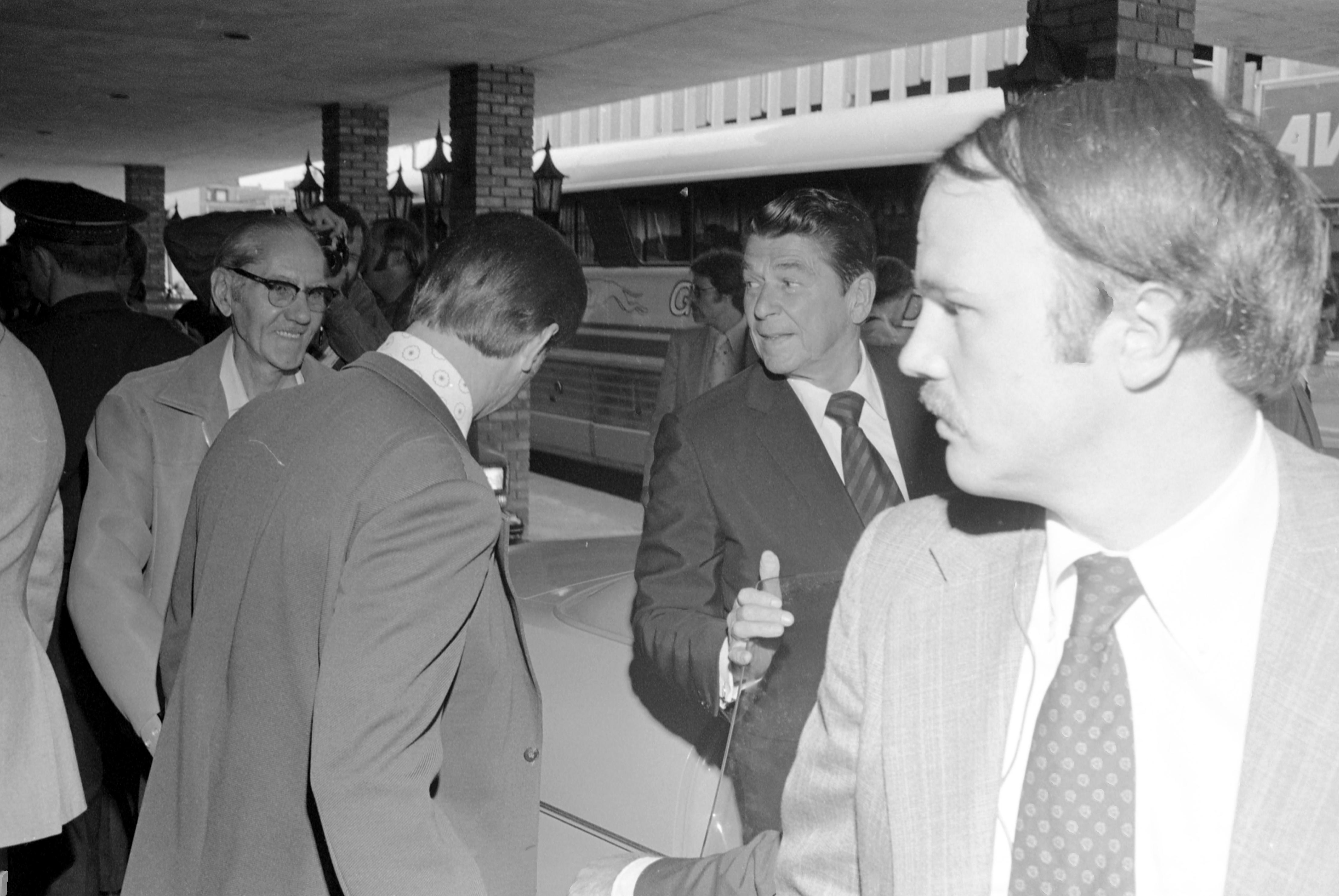 Ronald Reagan shaking hands with supporters, on the campaign trail on the 2nd of his 3 attempts to win the U.S. presidential nomination. The location is probably the Executive Inn at 600 Walnut St.