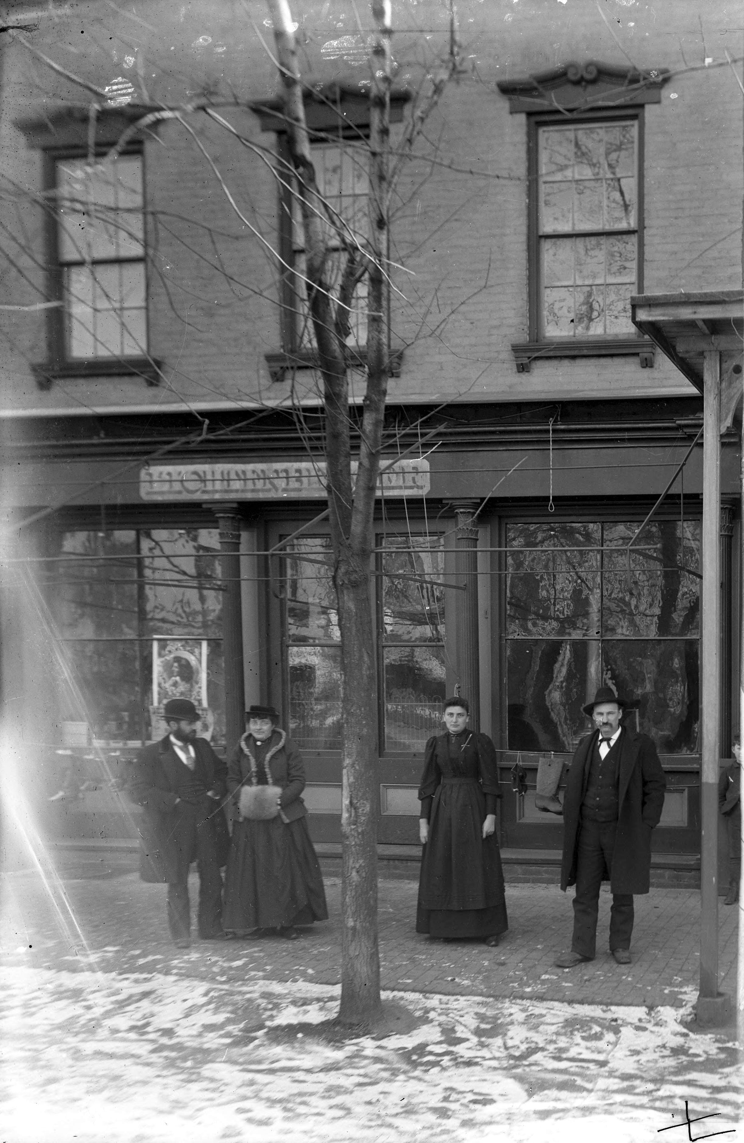 Two men and two women stand outside the Lichtenberger store - Clarence West is identified as the man on the right.