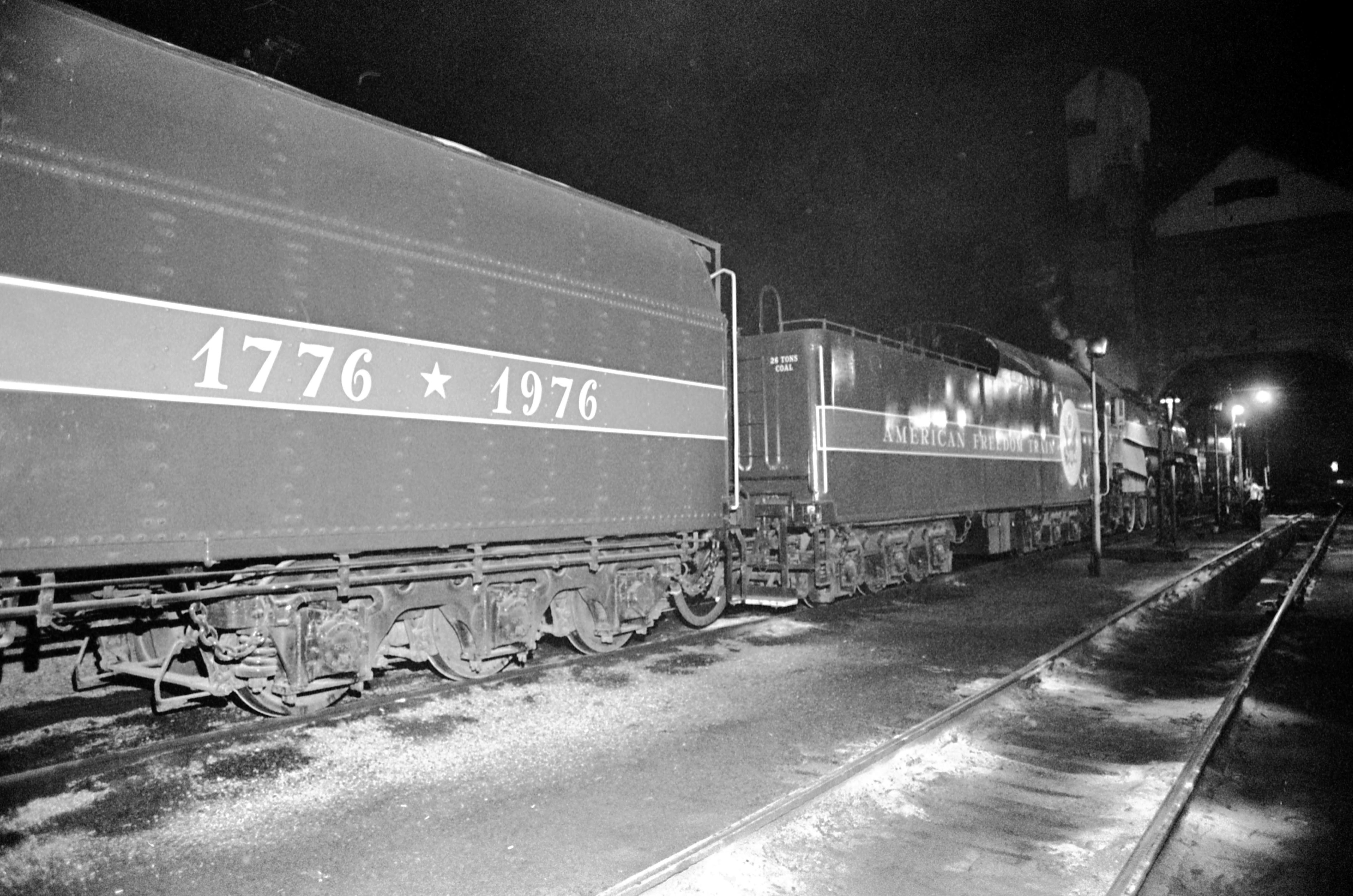 Looking down the side of the American Freedom Train, showing one of the display cars, which has the dates 1776 1976 on it.""The triumph of the steam-powered American Freedom Train was, indeed, the only nationwide celebration of the Bicentennial. It was pulled by steam locomotives in the age of the diesel, and would improve on the three display cars of its predecessor, the 1947 Freedom Train. The American Freedom Train would feature twelve display cars, ten that visitors would go aboard and pass through and two to hold large objects that would be viewed from the ground through huge ""showcase"" windows. The display cars were filled with over 500 precious treasures of Americana. Included in these diverse artifacts were George Washington's copy of the Constitution, the original Louisiana Purchase, Judy Garland's dress from The Wizard of OZ, Joe Frazier's boxing trunks, Martin Luther King's pulpit and robes, and even a rock from the moon. The American Freedom Train (AFT) was a 26-car train led by one of three enormous steam engines restored just for the occasion. Over a 21 month period from April 1, 1975 to December 31, 1976 more than 7 million Americans visited the train during its tour of all 48 contiguous states. Tens of millions more stood trackside to see it go by." (http://www.freedomtrain.org/american-freedom-train-home.htm) The Freedom Train's only visit to Evansville was June 15-17, when it was parked behind the Civic Center/Vanderburgh Auditorium at 715 Locust St.