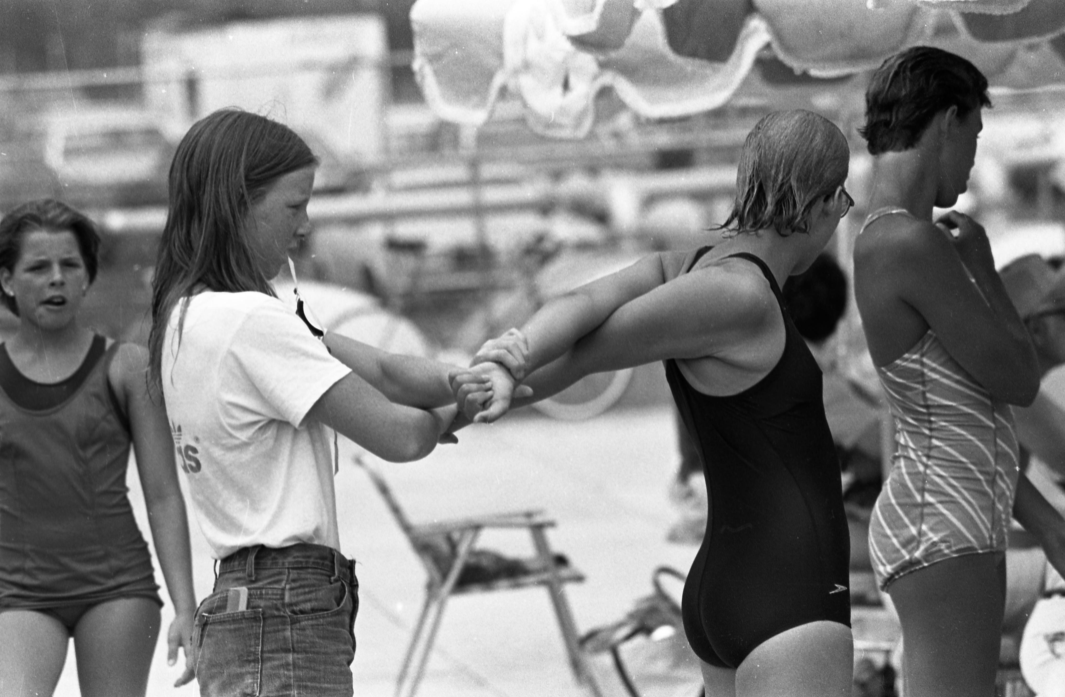 Girls in bathing suits, while one dressed in jeans and a T-shirt helps another stretch out her arms--maybe a swim meet?