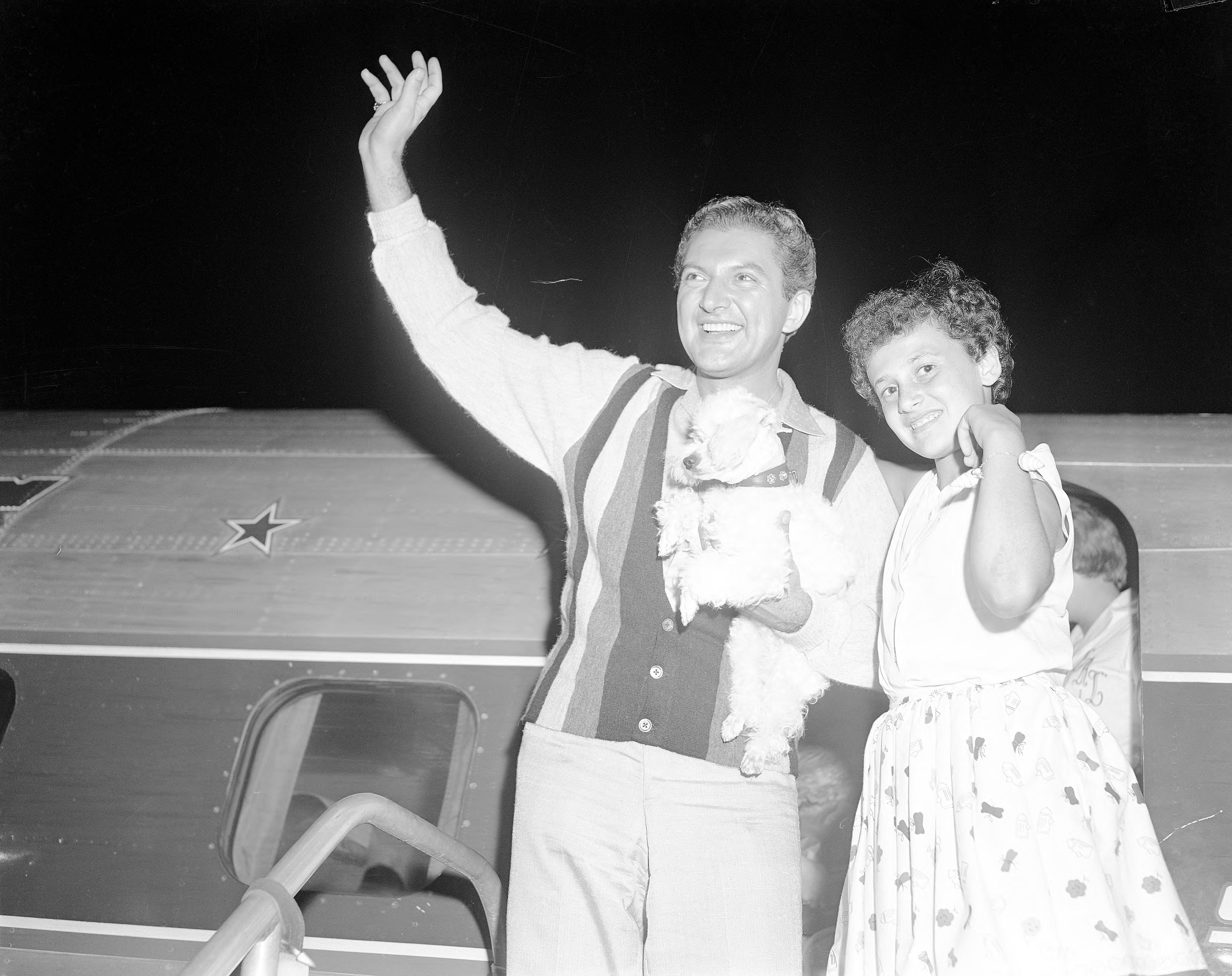 Liberace performed at Mesker Amphitheatre (Mesker Park Dr.) August 2-3, 1958; concurrently there was a meeting of the Liberace Fan Club International at the Vendome Hotel at 24 NW 3rd St., in the Empire Room. Here he is arriving at the airport, with a dog and a young friend.
