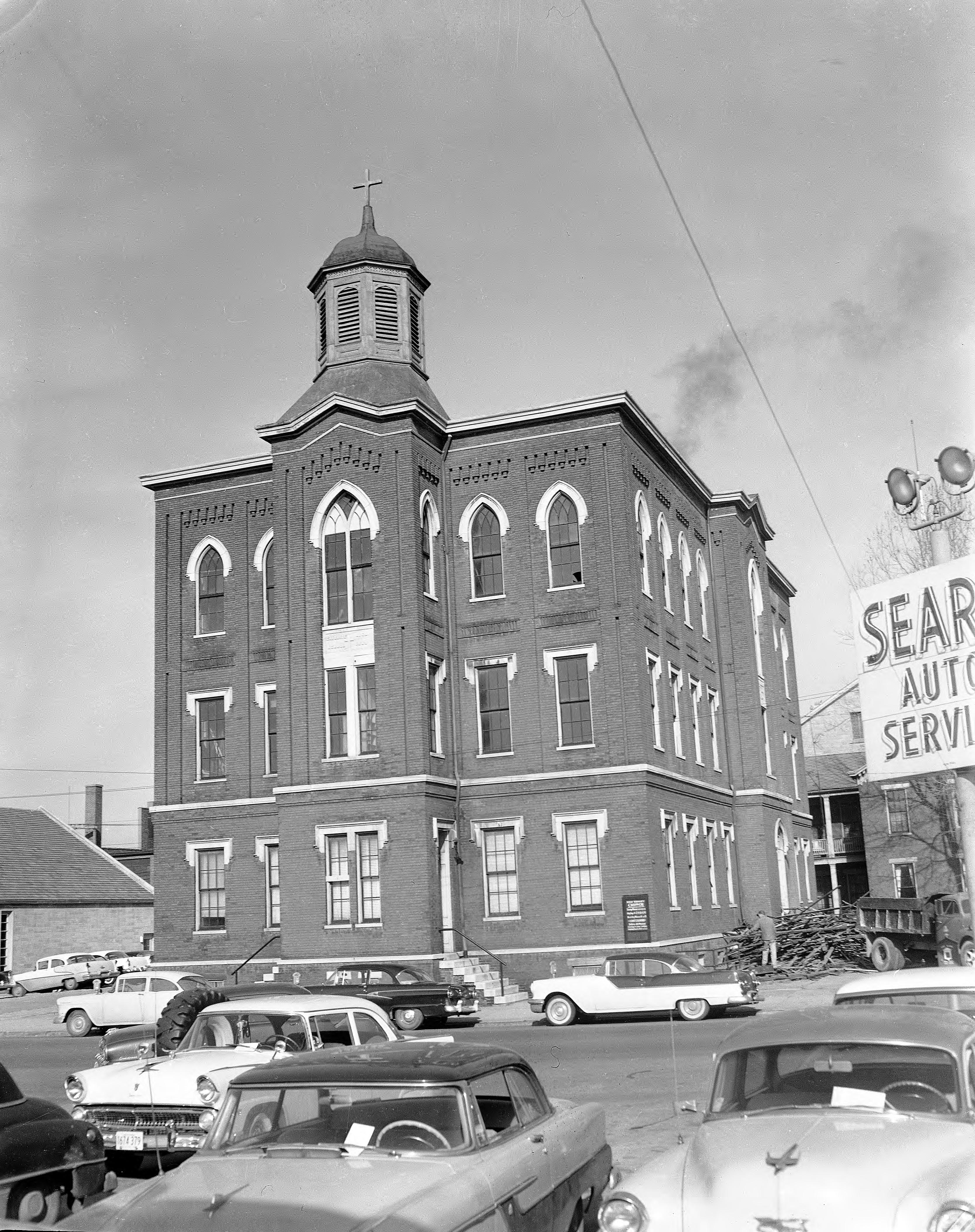 Beginning demolition of Holy Trinity School on NW 3rd St. at corner with Vine St. (The church's address was 219 NW 3rd St." Built in 1869, the school closed in 1949 and was razed in 1958. In this view, a portion of the sign for Sears Service Station at 200-06 NW 3rd St. is visible.