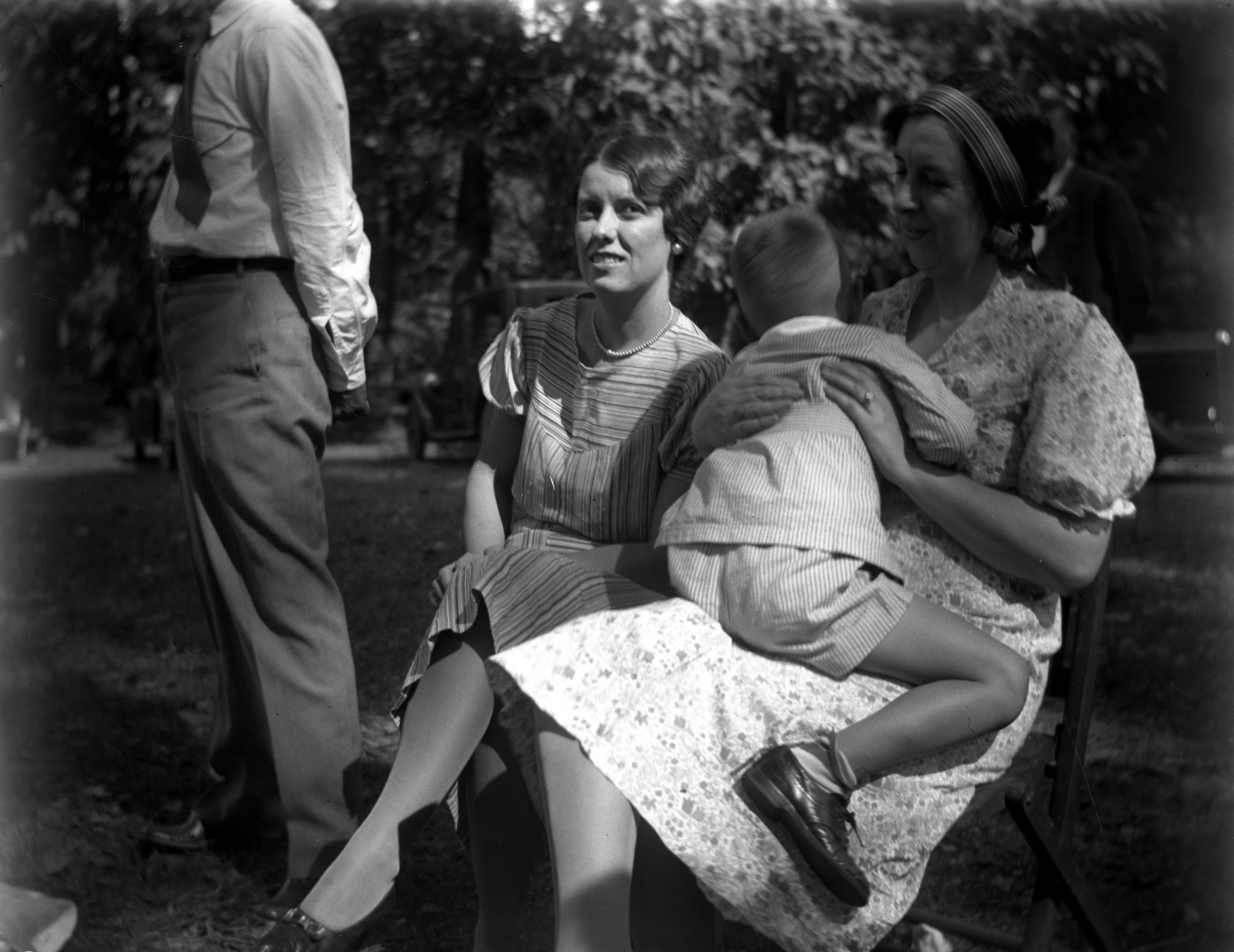 Amy Peva and Ruth Wolfe (with Jimmie Peva on her lap) with at Eastern Star picnic in Kemmerling's Woods. A Ruth Peva Wolfe (1898-1974) is buried in Maple Hill Cemetery. Those dates would make her an appropriate age for this photograph, but this cannot be regarded as positive identification. The relationship between her and the other two is unknown, possibly sister-in-law/nephew?