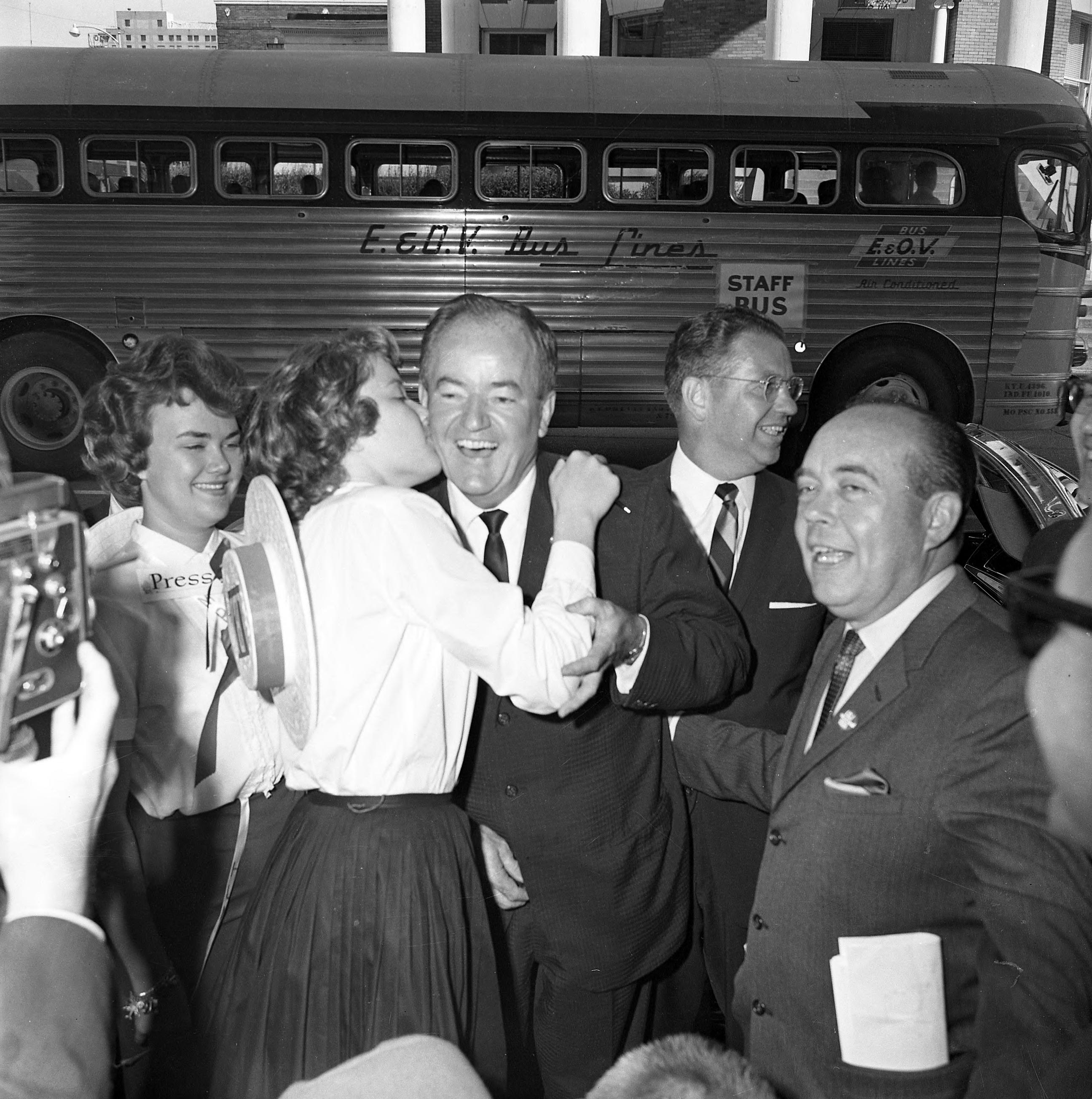 In 1964 then Senator Hubert Humphrey was in Evansville as the vice-presidential nominee on the ticket with Lyndon B. Johnson for president. Evansville Mayor Frank McDonald is next to him, and the man behind him is Indiana Senator Vance Hartke. This photograph appeared in the September 24, 1964 issue of the Evansville Courier with this headline:""Pretty Kathy Green, 15, of 1303 Stinson Avenue, gives Senator Hubert Humphrey a peck on the cheek Wednesday during his campaign stop here. Bonnie Pritchett, 16, of 3127 Emerson Street, is the other ""Humphrey girl."