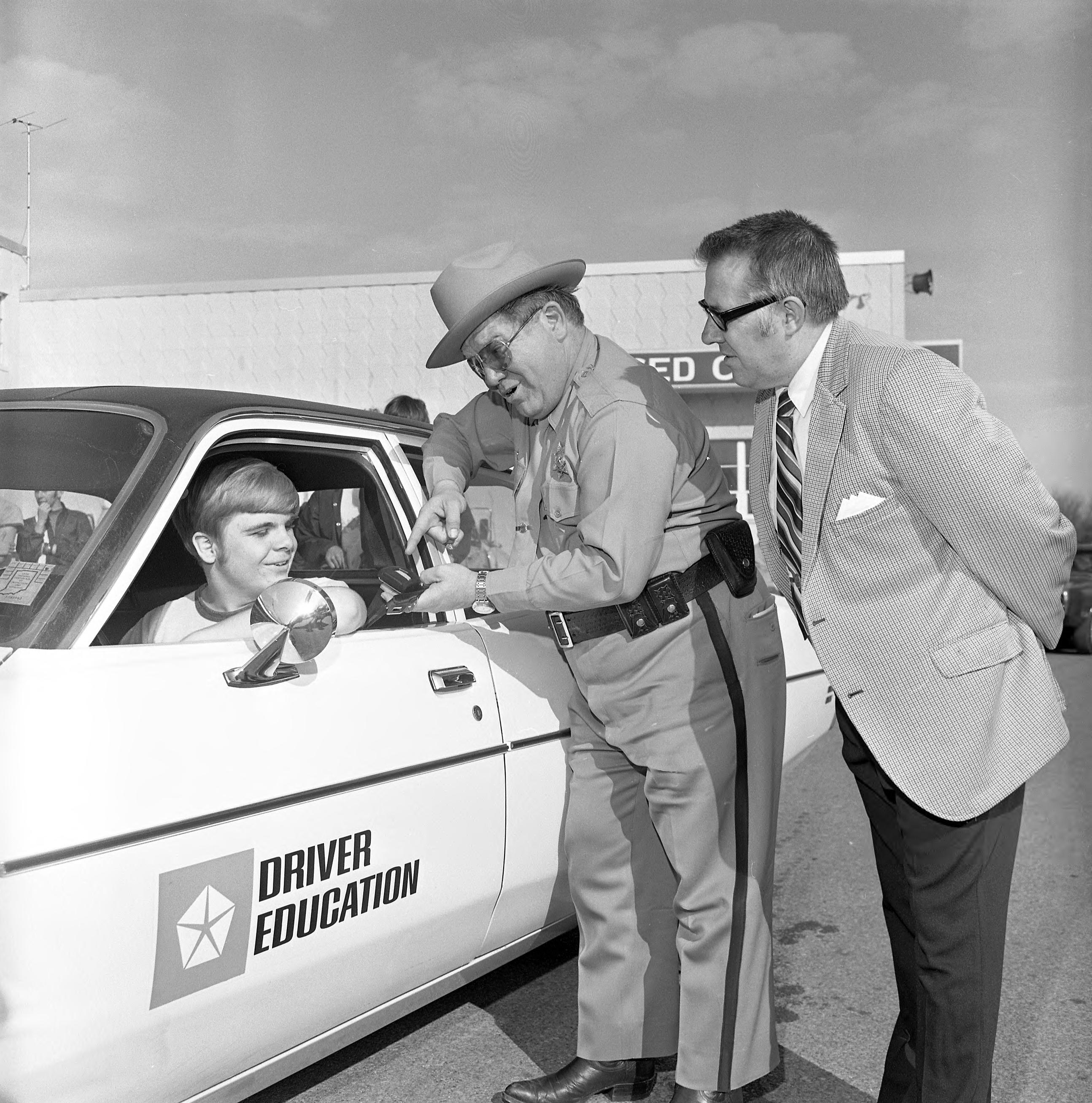 Dodge Safety Sheriff Joe Higgins at Vandeveer Dodge at 500 S. Green River Rd. Joe Higgins was an actor and longtime promoter for the Dodge brand. He is best known for his tagline,""Y'all drive real careful now, ya heah?" Here he ""lays down the law"" to a unidentified drivers education student. The other man in the photograph is unidentified.