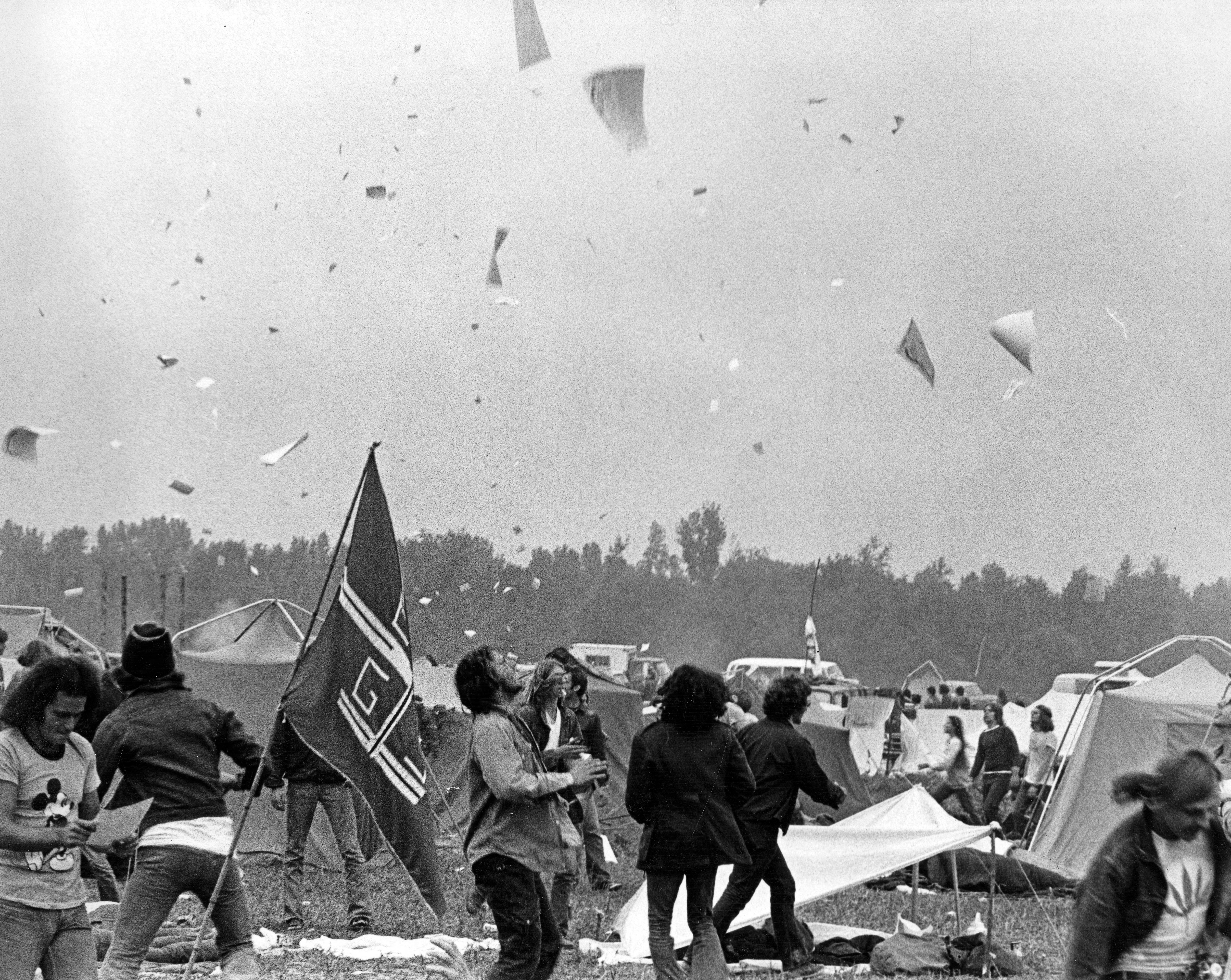 Over the Labor Day weekend in 1972, 2 promoters planned to hold a rock music festival on the grounds of a racetrack in Chandler, Indiana, billed as the Erie Canal Soda Pop Festival. Indiana officials prohibited the use of the initial site, forcing promoters to a last minute move to Bull Island, a piece of land jutting out into the Wabash River. Only accessible from Indiana, Bull Island was east of the river, but through a technicality based on the original course of the river, it was officially in Illinois' jurisdiction. (Bull Island is how this festival is most commonly known.) Expected crowds of 55,000 swelled to 200,000 to 300,000. Law enforcement (only 3 deputy sheriffs were on scene), access (cars were parked for 4 miles along the interstate as drivers and passengers then hiked in), sanitation, food, and water were completely inadequate. Many of the promised performers did not show. Sex, drugs, and rock and roll was the order of the day. A torrential rainstorm furthered the chaos; the event ended withn 2 deaths, overturned and robbed food trucks, the stage being burned, mounds of debris, and massive legal problems for the 2 promoters.