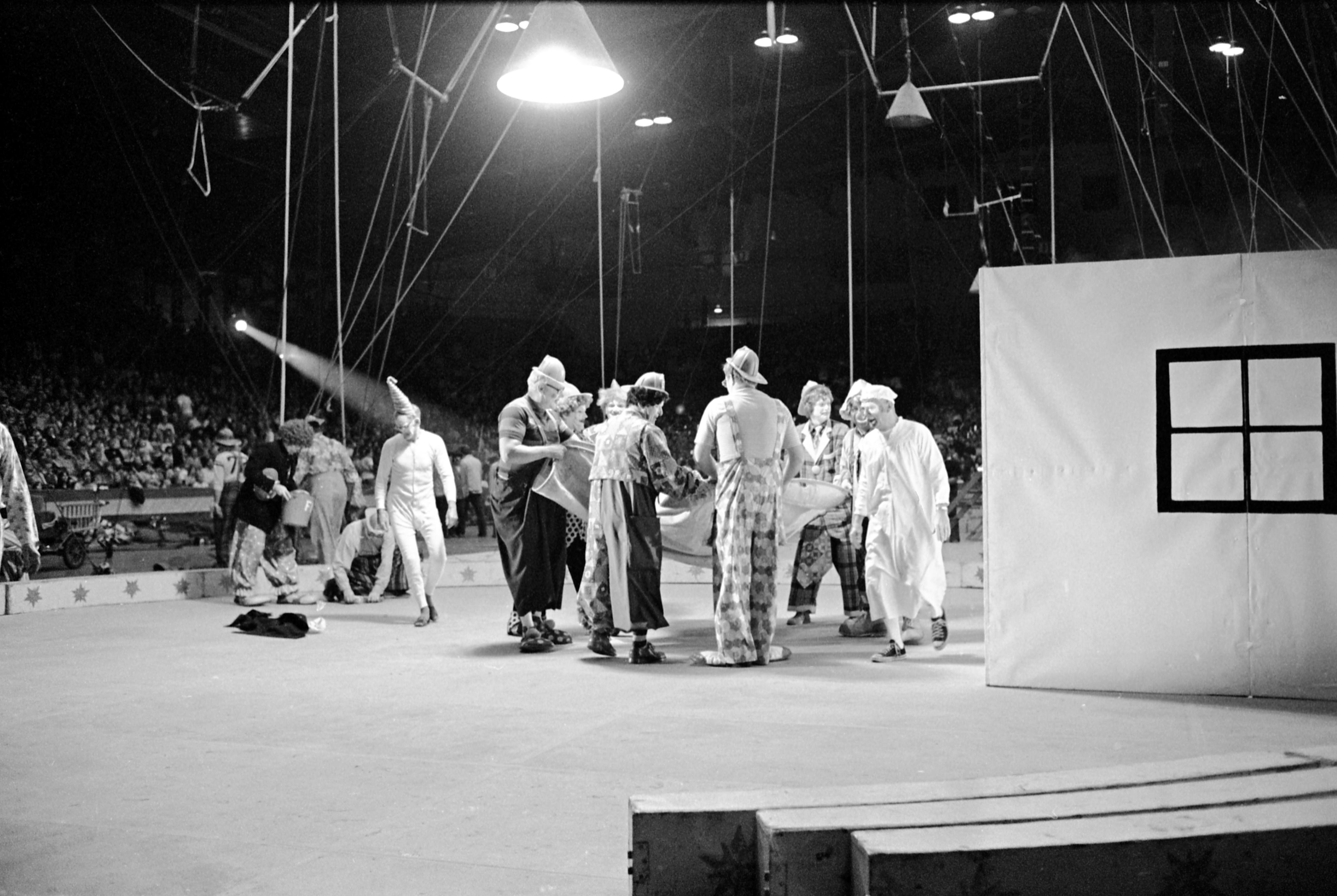 Hadi Shrine Circus clowns preparing to ""rescue a man from a burning building""