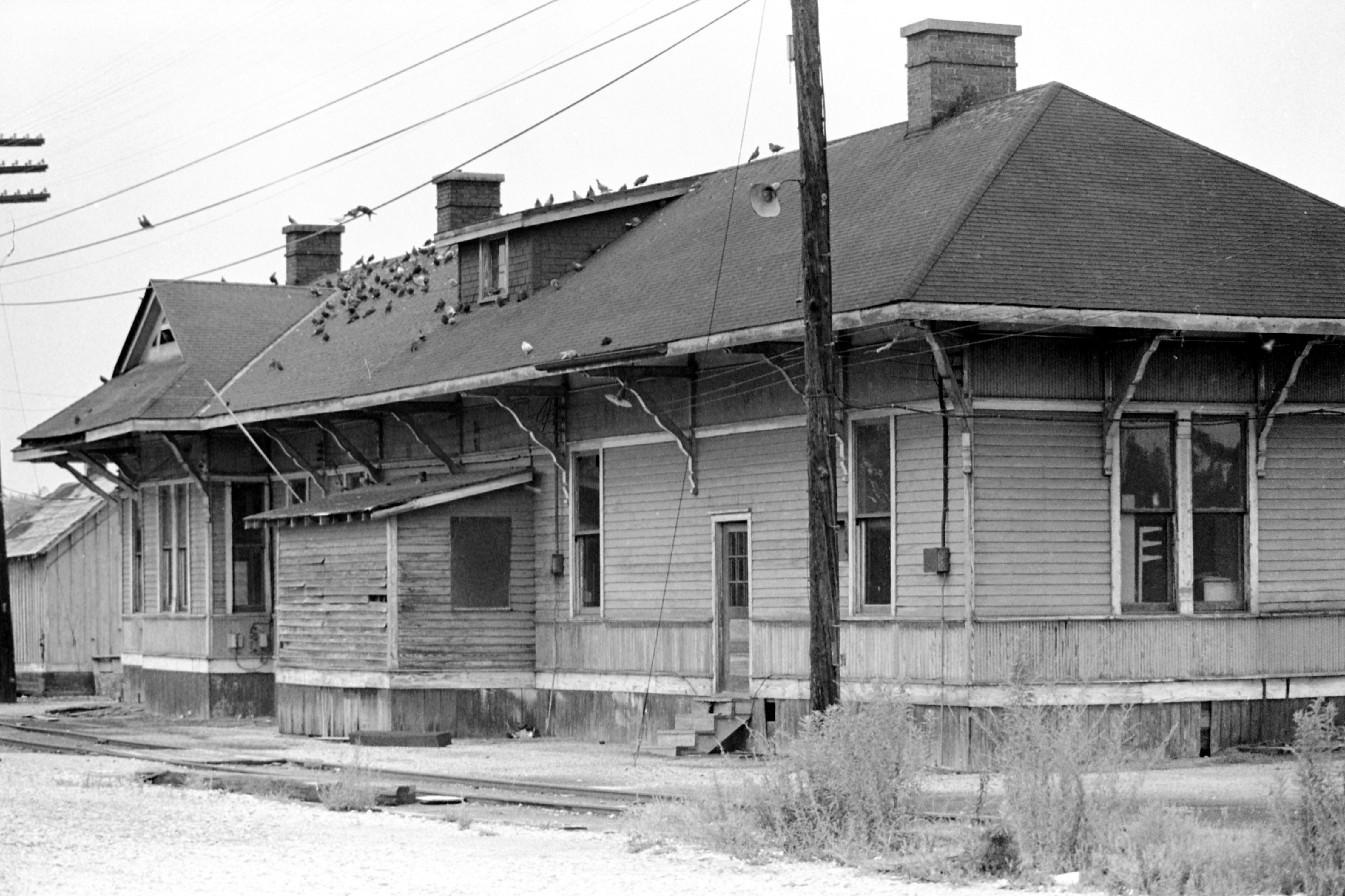Old, ramshackle train depot, with pigeons on roof