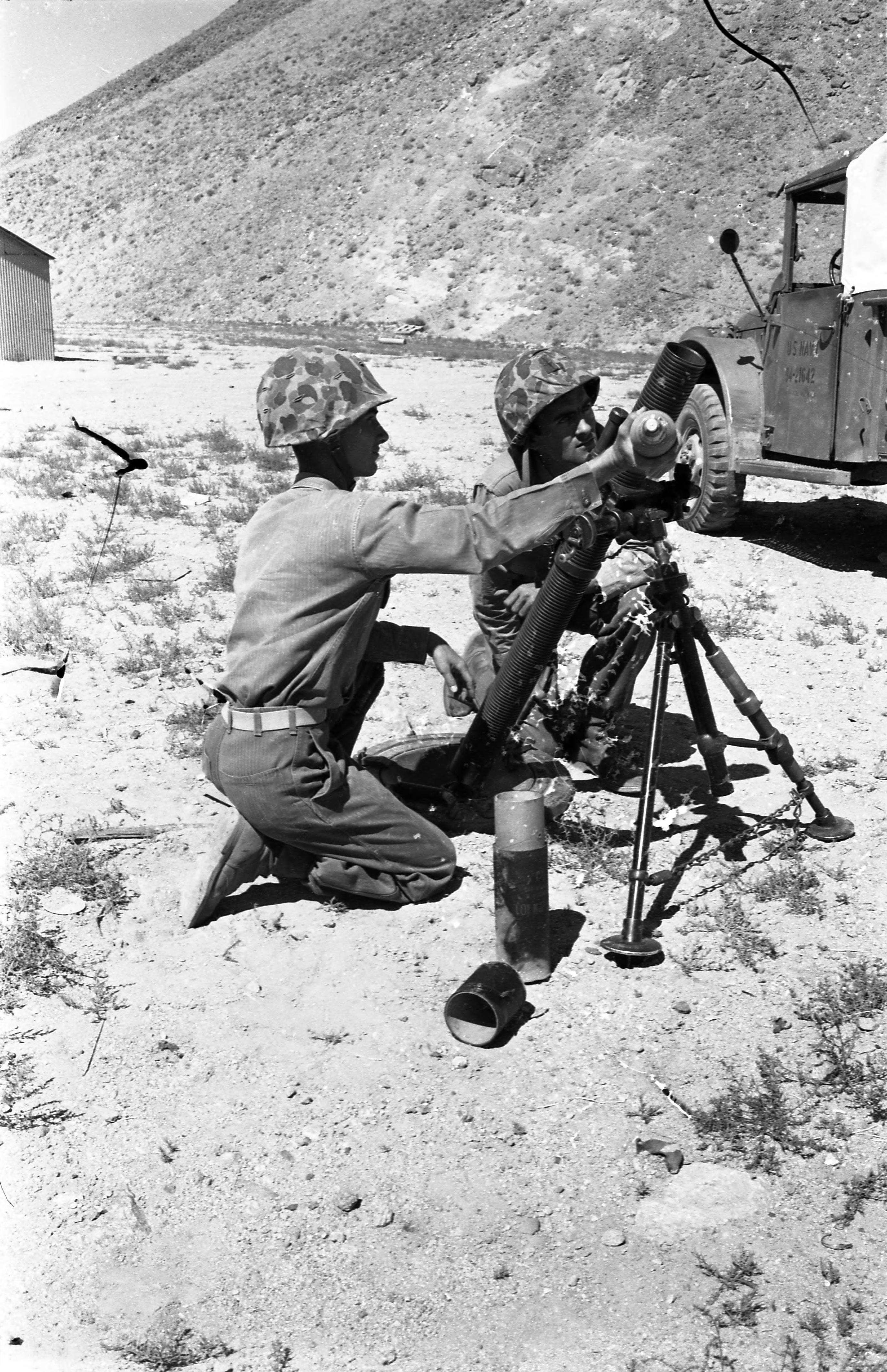 Evansville's 17th Rifle Co. Marine Reserves attended summer training at Hawthorne Naval Ammunition Depot (now called Hawthorne Army Depot). With over 147,000 acres/226 square miles, it is the world's largest depot and a frequent site for desert training. Here 2 soldiers prepare to load a weapon.