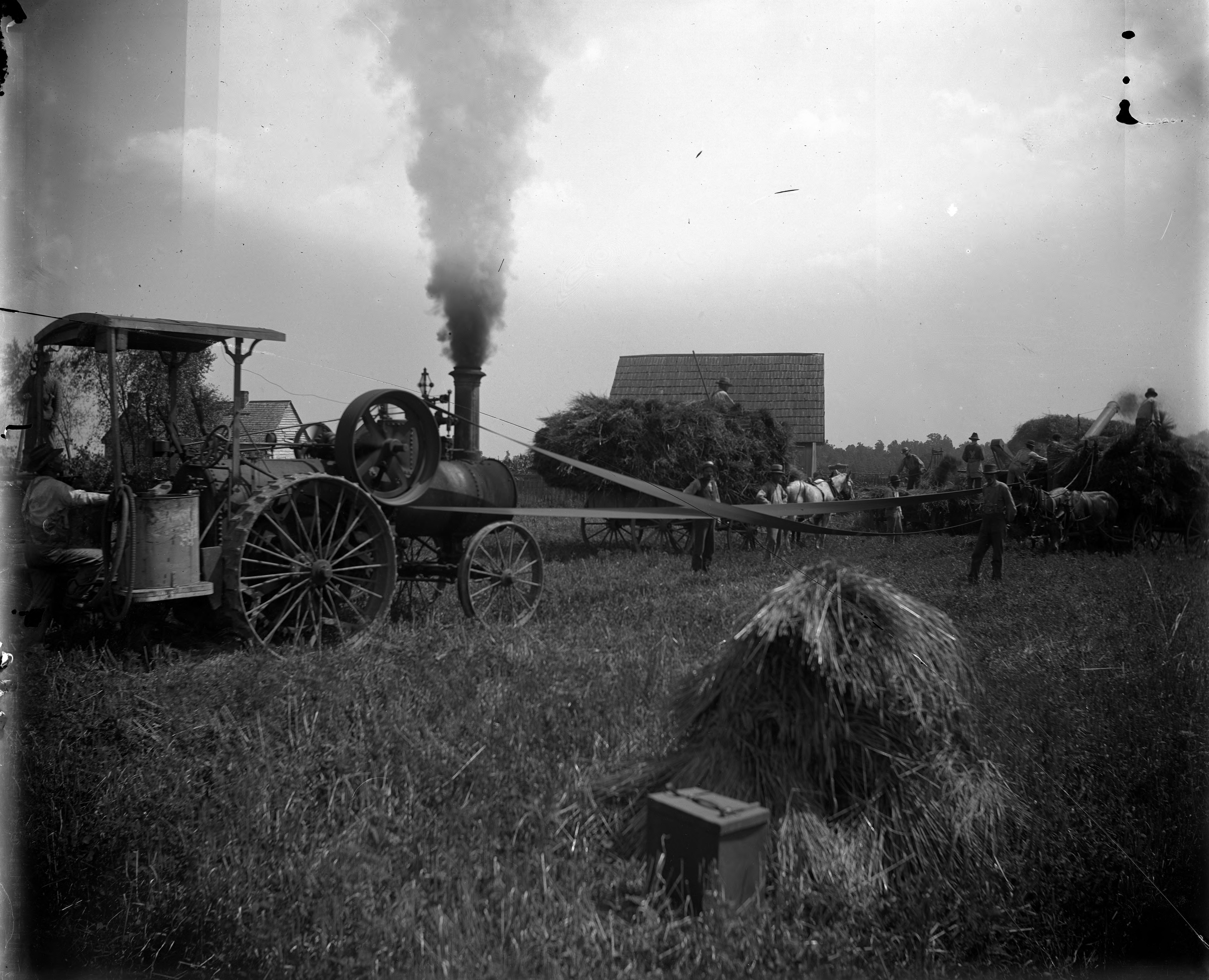 ""The steam engine tractor was excellent technology although somewhat uncommon. Steam engines were expensive and required a good amount of man-power to operate proficiently. This is a Posey County farm scene of a threshing machine (in the background) as the long belt delivers power from the steam engine." (Home Town Heroes, p. 187).