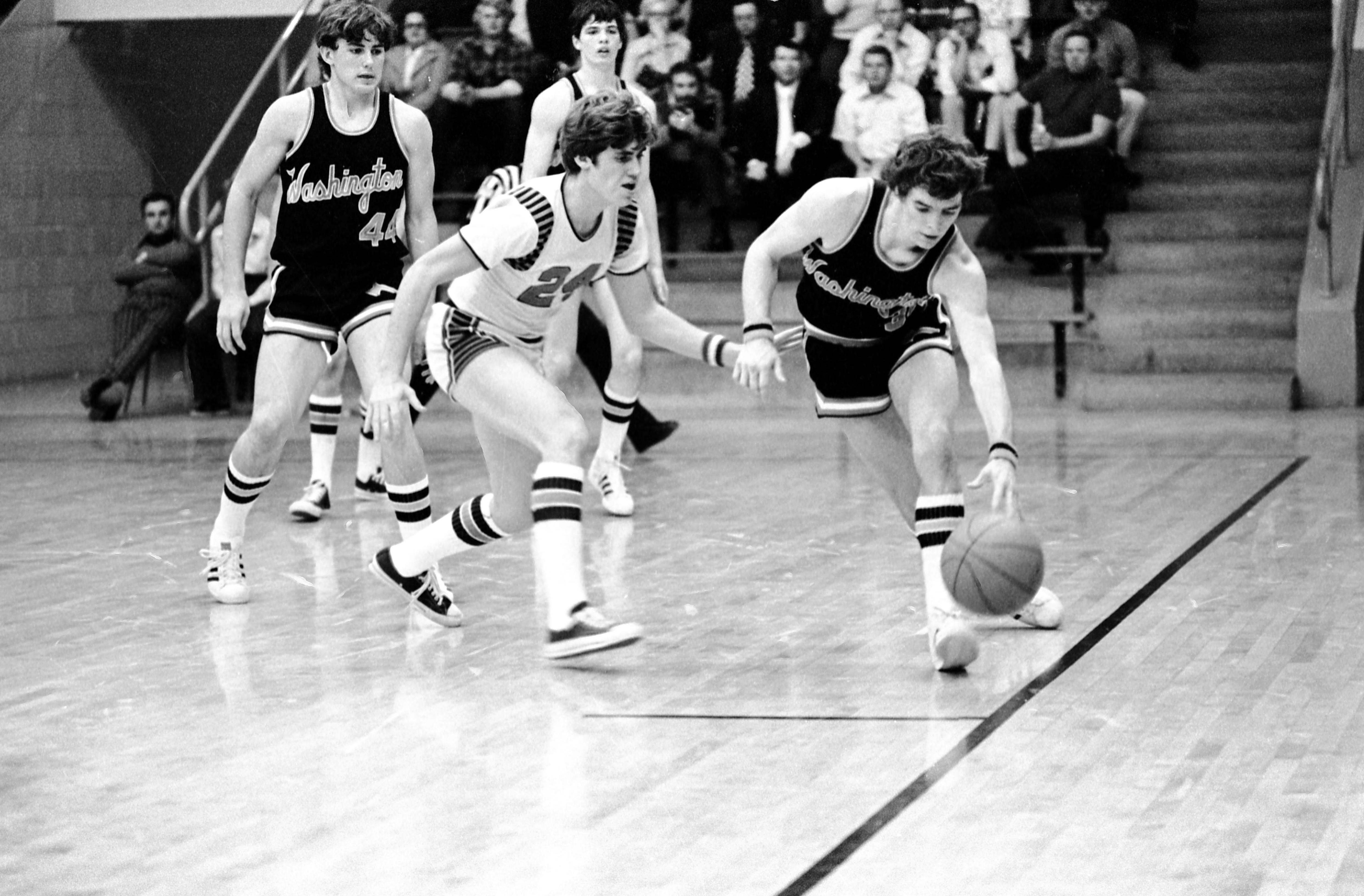 Basketball game, with one team's uniform saying Washington. The other team's identity is unknown, and it is unclear if this is high school or college. The seating does not look like bleachers, so this is possibly Roberts Municipal Stadium at 2600 Division St. This facility was razed in 2013.