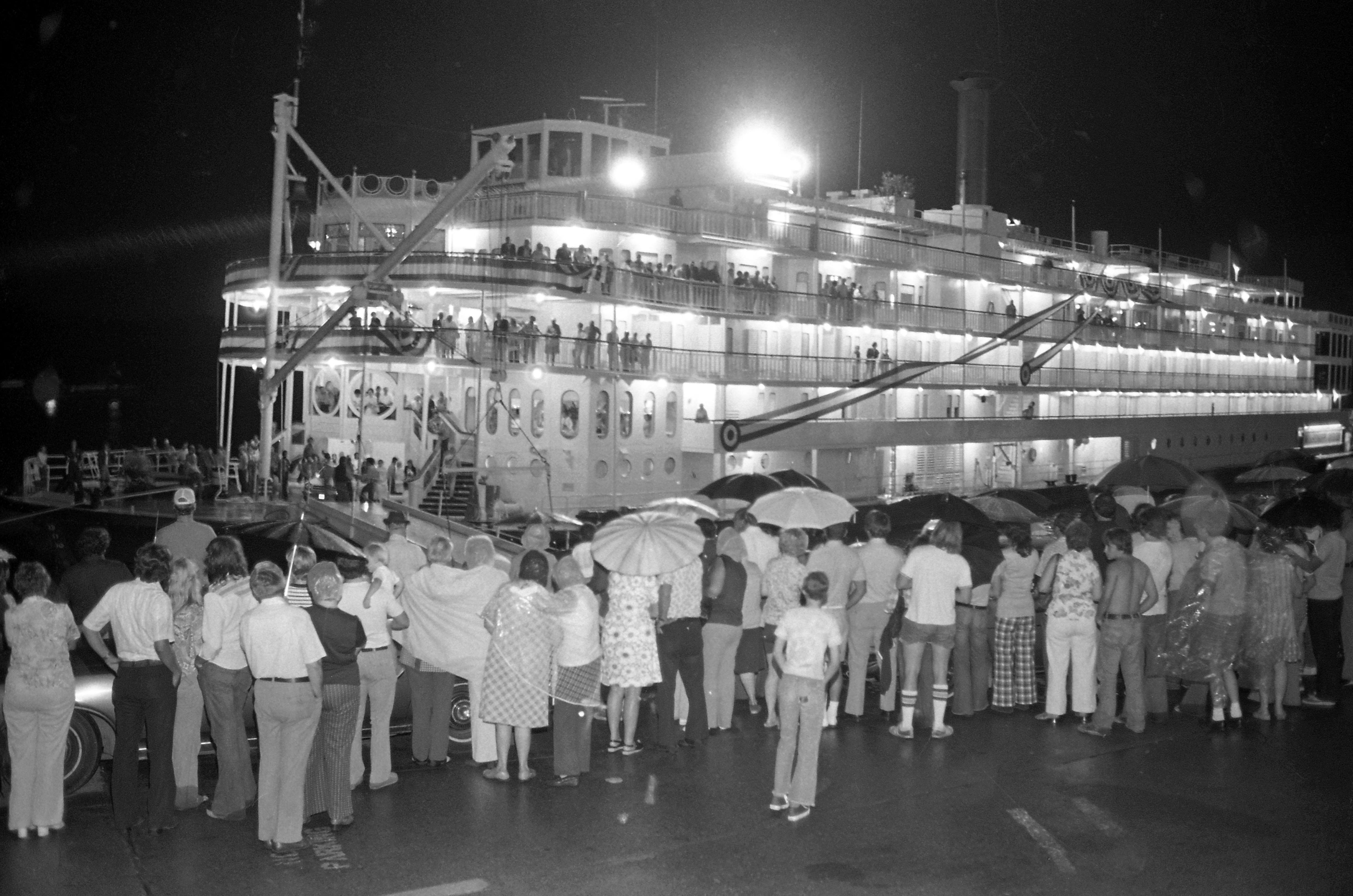Crowd of people, standing on shore, many with umbrellas, greeting the arrival of the Mississippi Queen. It appears as though the gangplank is being lowered into position. There are a number of people on the boat, too. There are cars in front of the crowd. The July 29, 1976 Evansville Press called it ""the palatial giant of the rivers." The $23.9 million, 379 foot long boat was to put in just long enough to take on water. (SEE ALSO MSS 034-0631)