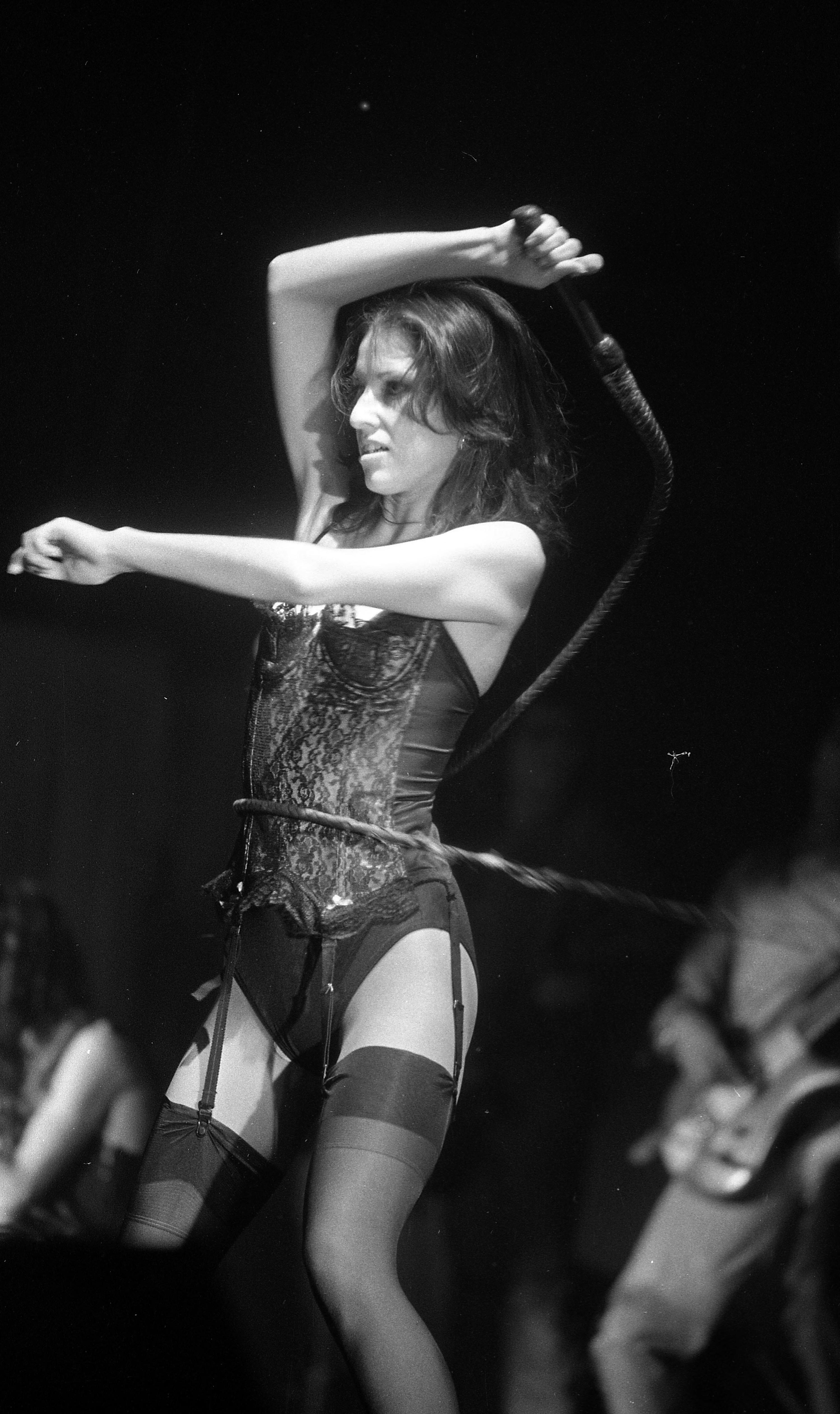 Alice Cooper's wife, Sheryl Goddard Cooper, on stage, holding a whip, during his Madhouse Rock concert, meant to depict his recent alcohol detoxification treatment