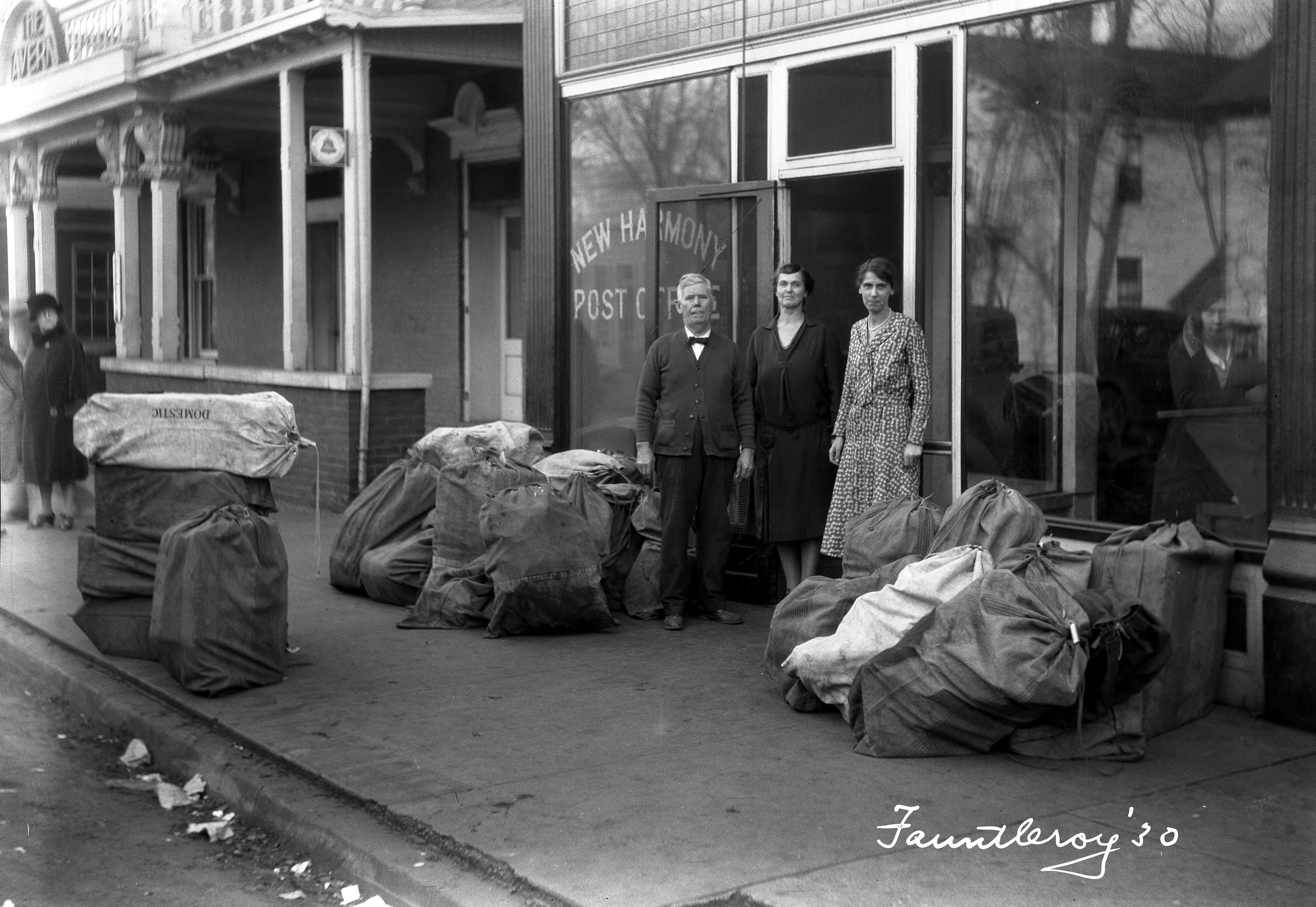 A man and two women ( Barbara Glump in middle) stand outside the New Harmony Post Office with large mail bags full of the New Harmony Times Bridge edition. This was on Church St.--the Harmony Tavern, forrmely Rappite/Harmonist dormitory no. 3--is on the left.