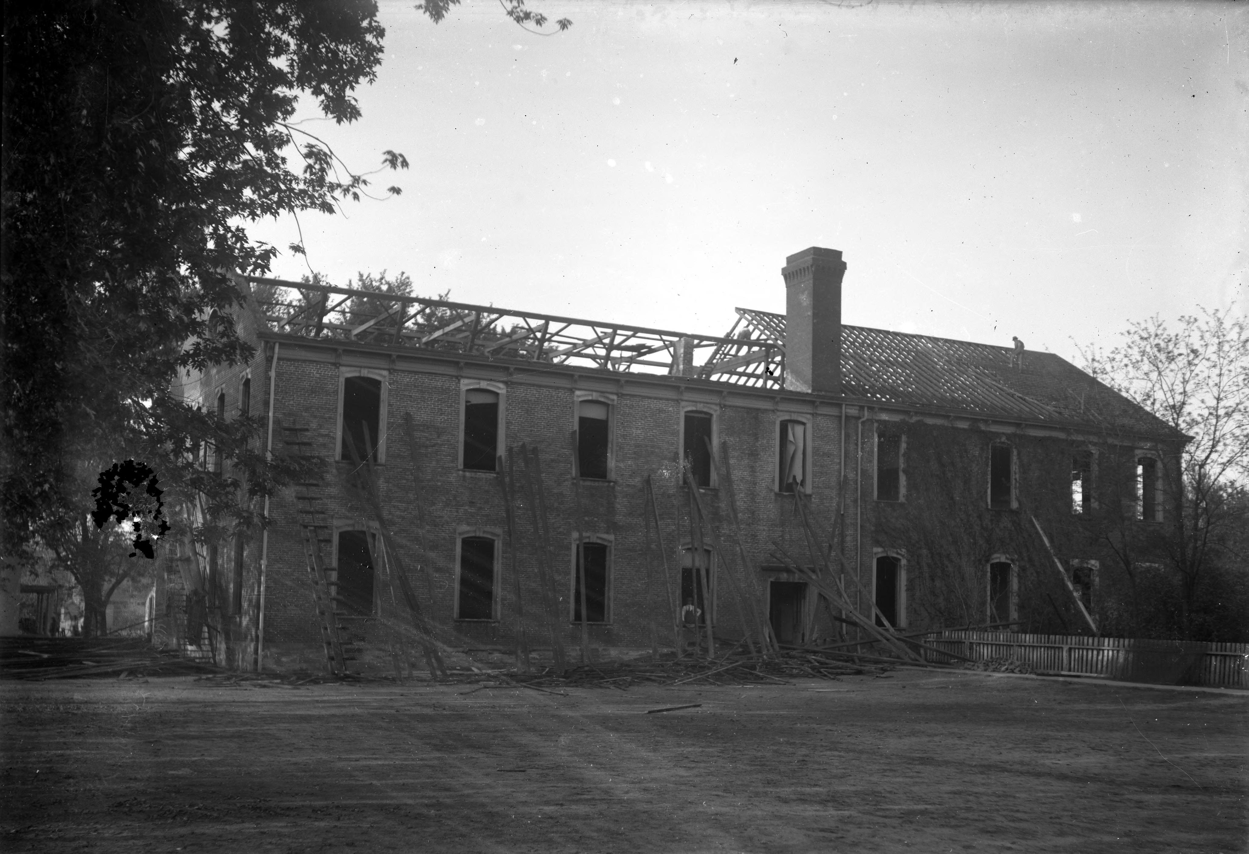 New Harmony School at 1000 East St.. The school, which opened in the early 1800s and was remodeled from the old Rappite/Harmonist church, particularly the door, closed in 2012. This is the old school being torn down in 1913/1914--it was then rebuilt for the Centennial celebration.