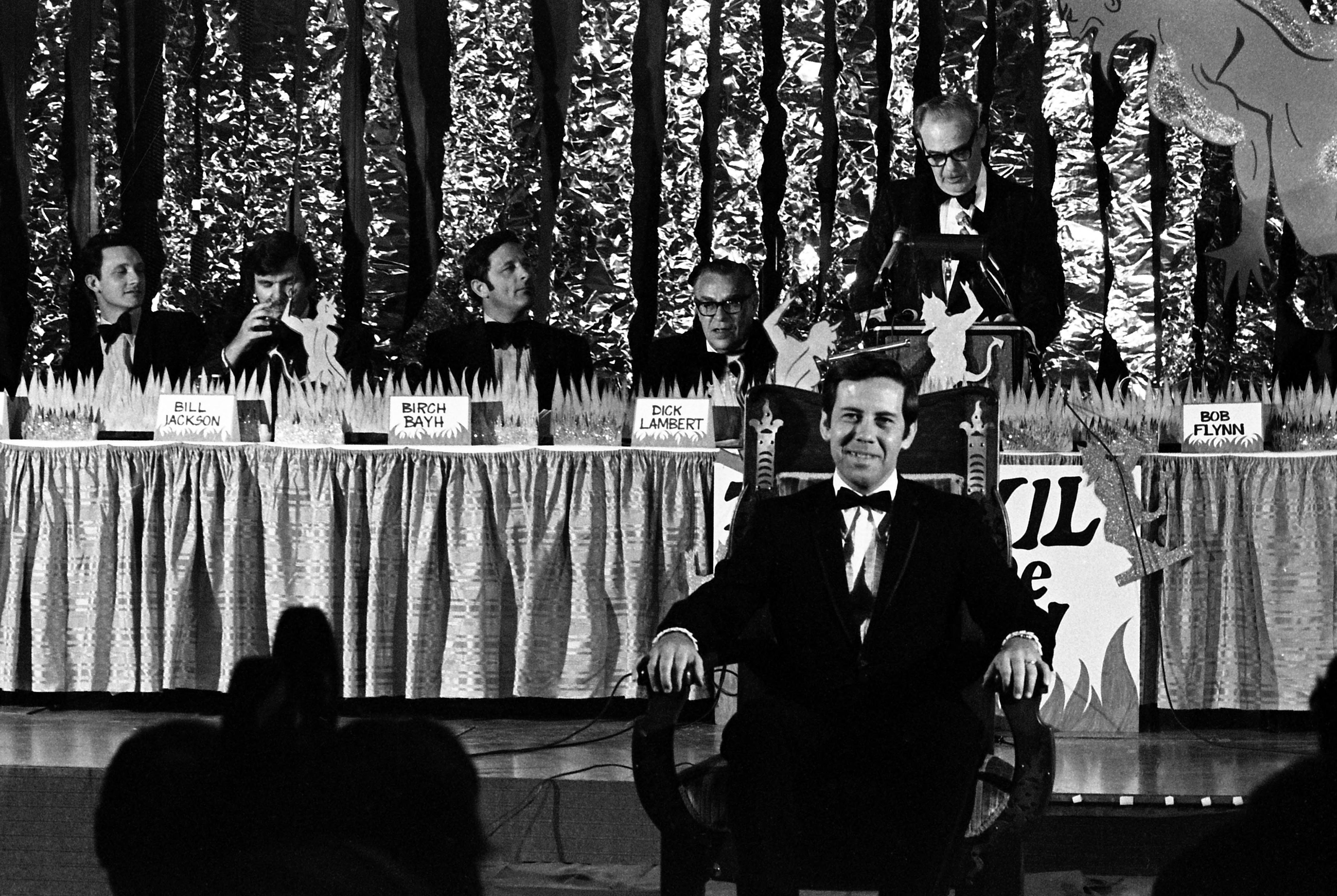 This appears as though it may be a roast of some sort, entitled ""The Devil Made Me Do It." The venue appears to be the Civic Center/Vanderburgh County Auditorium at 715 Locust St. (This facility no longer exists.) Richard Lugar sits in a chair in front of a panel of ""roasters," including Bill Jackson, Birch Bayh, Dick Lambert, and the man at the dais, Bob Flynn At the time of this photograph, Richard Lugar was the Republic mayor of Indianapolis and Birch Bayh was the Democratic U.S. Senator from Indiana. Bill Jackson was the editor of the Evansville Courier. Bob Flynn was the City Hall reporter for the Evansville Press.