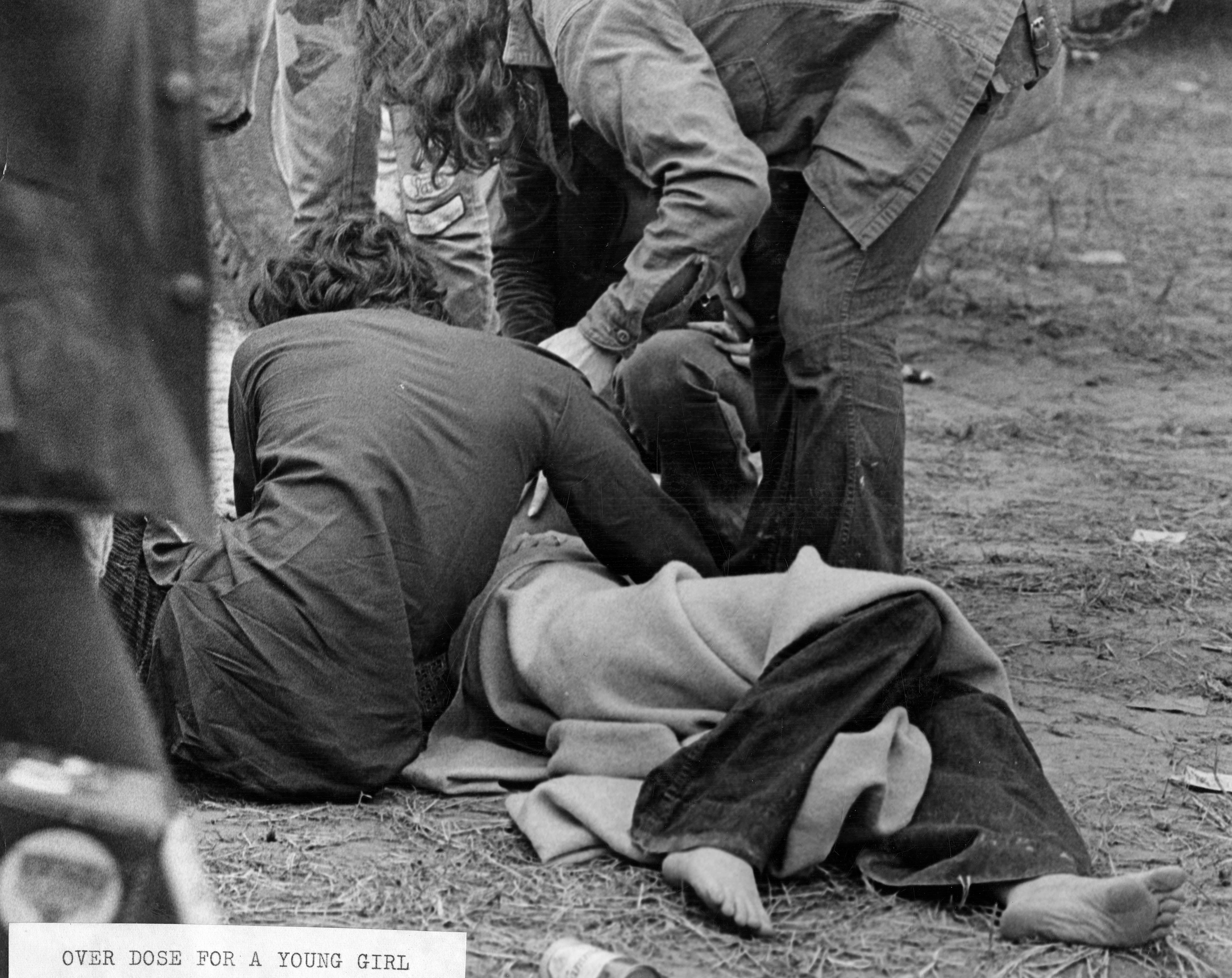 Over the Labor Day weekend in 1972, 2 promoters planned to hold a rock music festival on the grounds of a racetrack in Chandler, Indiana, billed as the Erie Canal Soda Pop Festival. Indiana officials prohibited the use of the initial site, forcing promoters to a last minute move to Bull Island, a piece of land jutting out into the Wabash River. Only accessible from Indiana, Bull Island was east of the river, but through a technicality based on the original course of the river, it was officially in Illinois' jurisdiction. (Bull Island is how this festival is most commonly known.) Expected crowds of 55,000 swelled to 200,000 to 300,000. Law enforcement (only 3 deputy sheriffs were on scene), access (cars were parked for 4 miles along the interstate as drivers and passengers then hiked in), sanitation, food, and water were completely inadequate. Many of the promised performers did not show. Sex, drugs, and rock and roll was the order of the day. A torrential rainstorm furthered the chaos; the event ended withn 2 deaths, overturned and robbed food trucks, the stage being burned, mounds of debris, and massive legal problems for the 2 promoters. A typewritten caption on this photograph says,""Over dose for a young girl." NOTE: there was an overdose death, but it was a man, so apparently this girl survived.