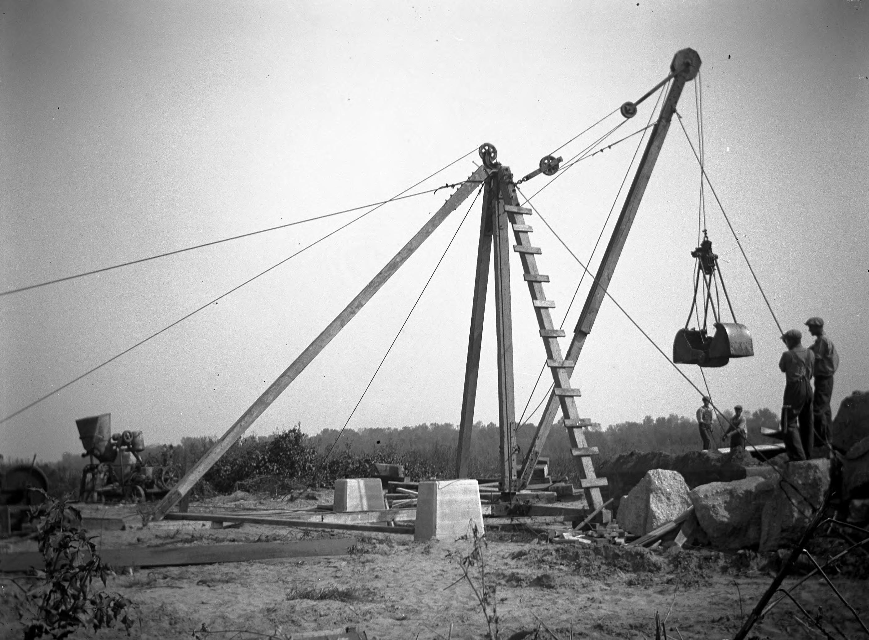 Harmony Way Bridge, construction derrick at new pier on the Illinois side of the Wabash River. Until the Harmony Way bridge between Posey County, IN and White County, IL was built in 1930, a ferry would have been the only means of access. This bridge is now closed due to being structurally deficient, and lack of funding to effect repairs.