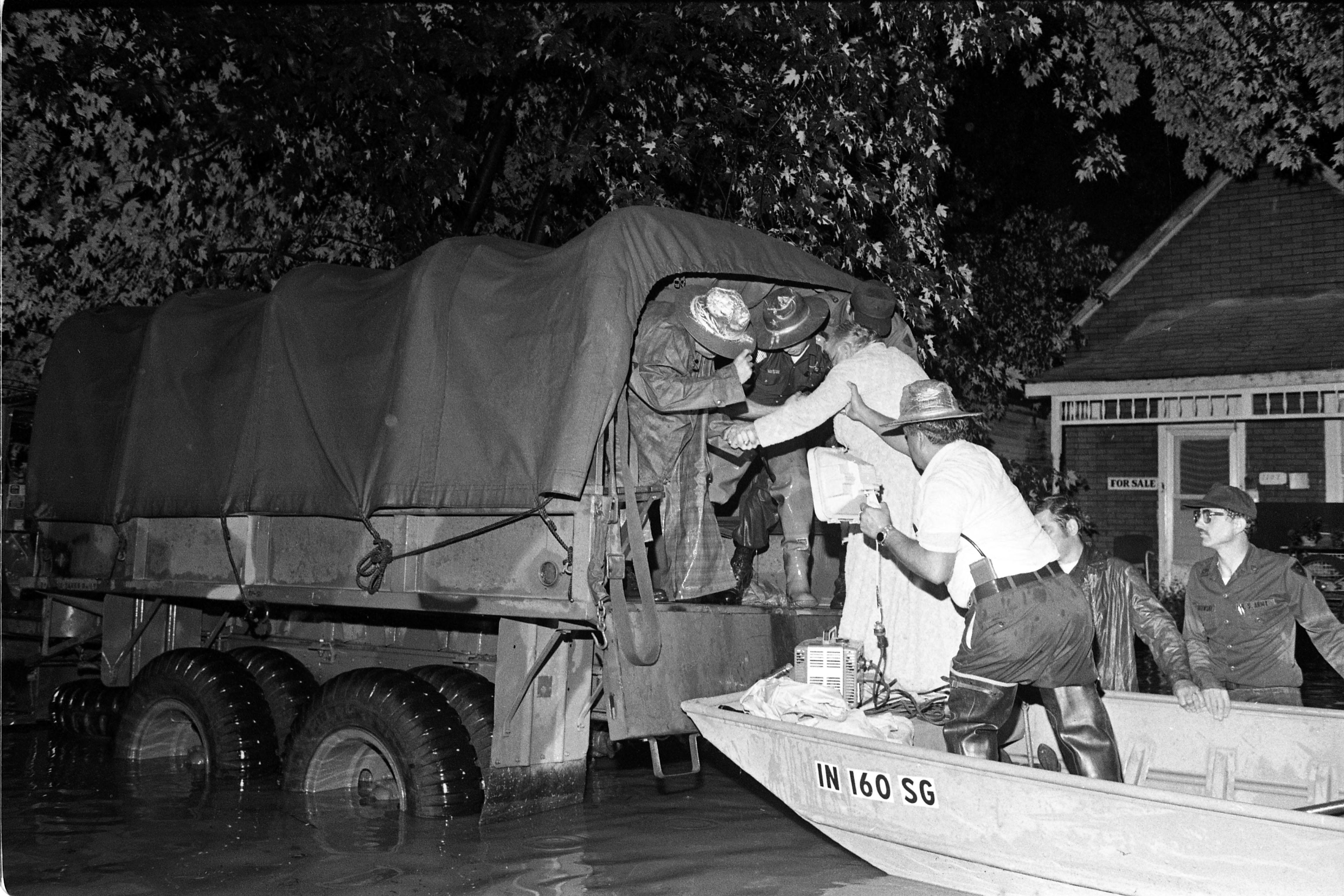 This photograph depicts the rescue of 83 year old Mrs. Myrtle Grubb from her porch on the south side of Princeton, IN by Gibson County sheriff's deputy Nick Michas. Torrential rains brought 8.9 inches of rain to Princeton over a 48 hour period, and 14.9 inches to English and Marengo, other small southern Indiana towns, causing rapid flooding. Up to 11 counties were considered disaster areas.