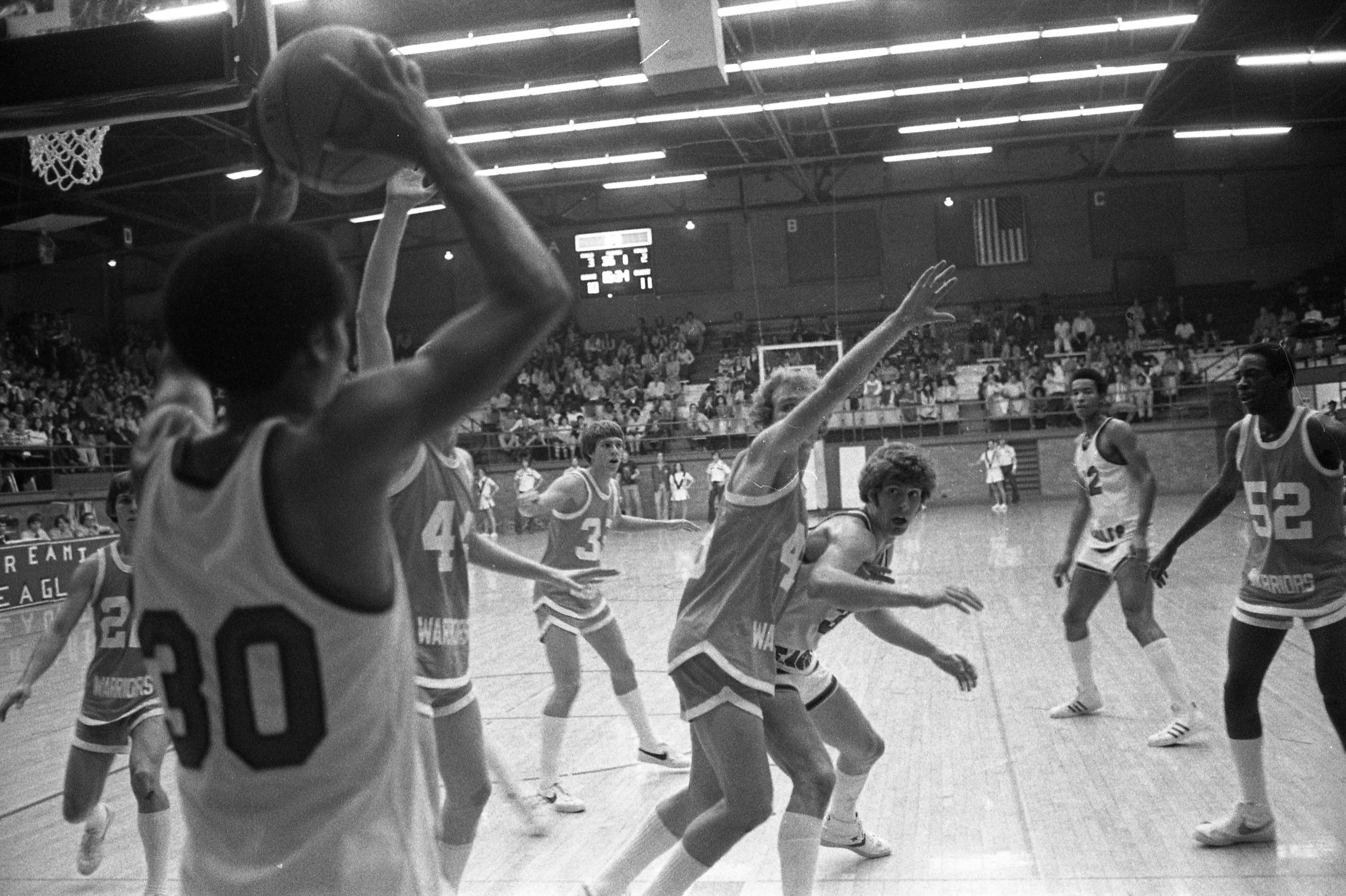ISUE (Indiana State University Evansville, now USI/University of Southern Indiana) Eagles playing basketball against the Indiana Tech Warriors. ISUE won, 91-75. Player no. 30 cannot be identified.