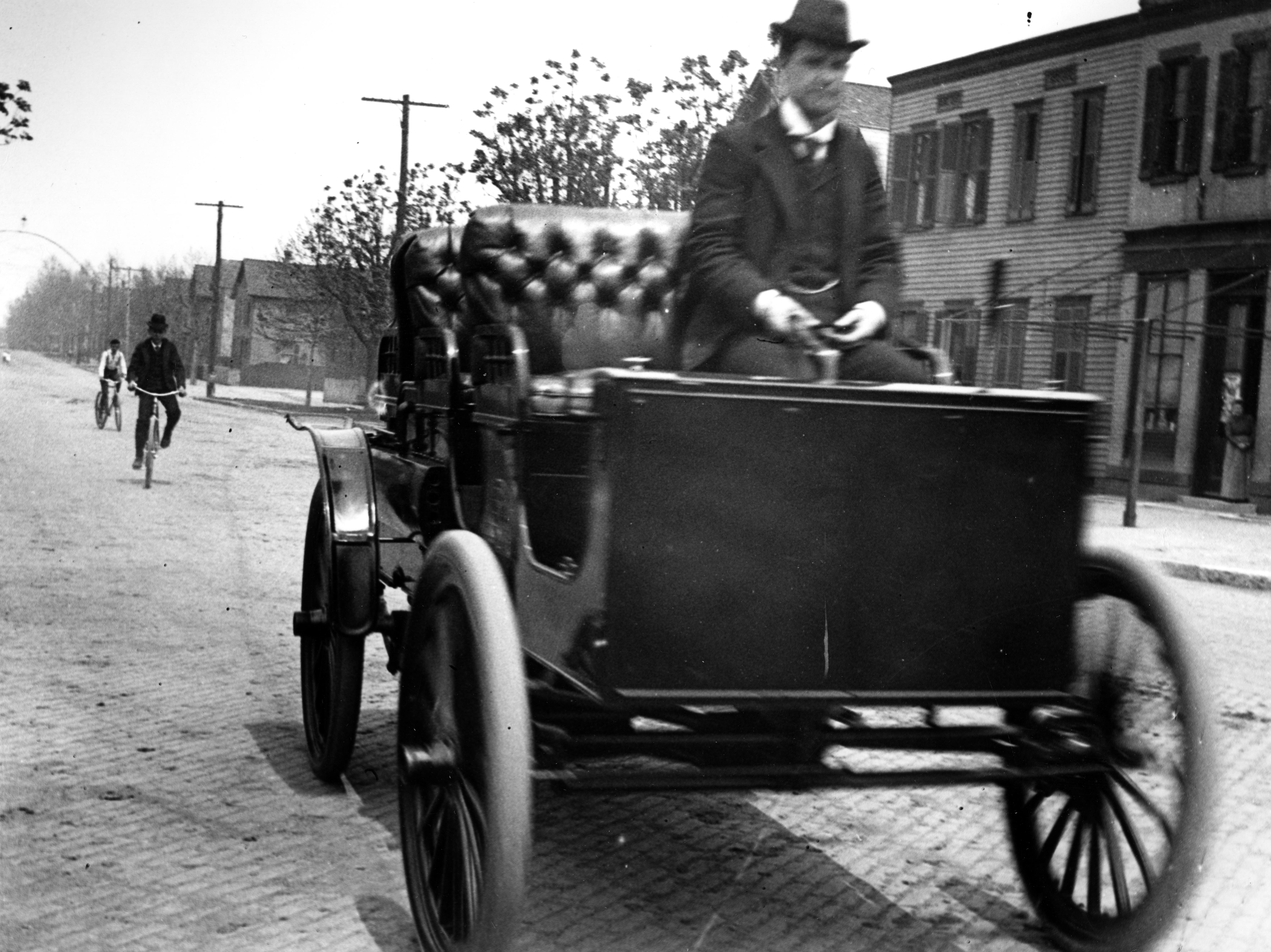 Man driving a motorized buggy on an unidentified brick residential street. Two men on bicycles are behind him. This buggy looks very much like pictures of the Sears Motor Buggy, available from 1909-1911/1912 for $395. (http://searsmotorbuggy.com/Sears_history.php).