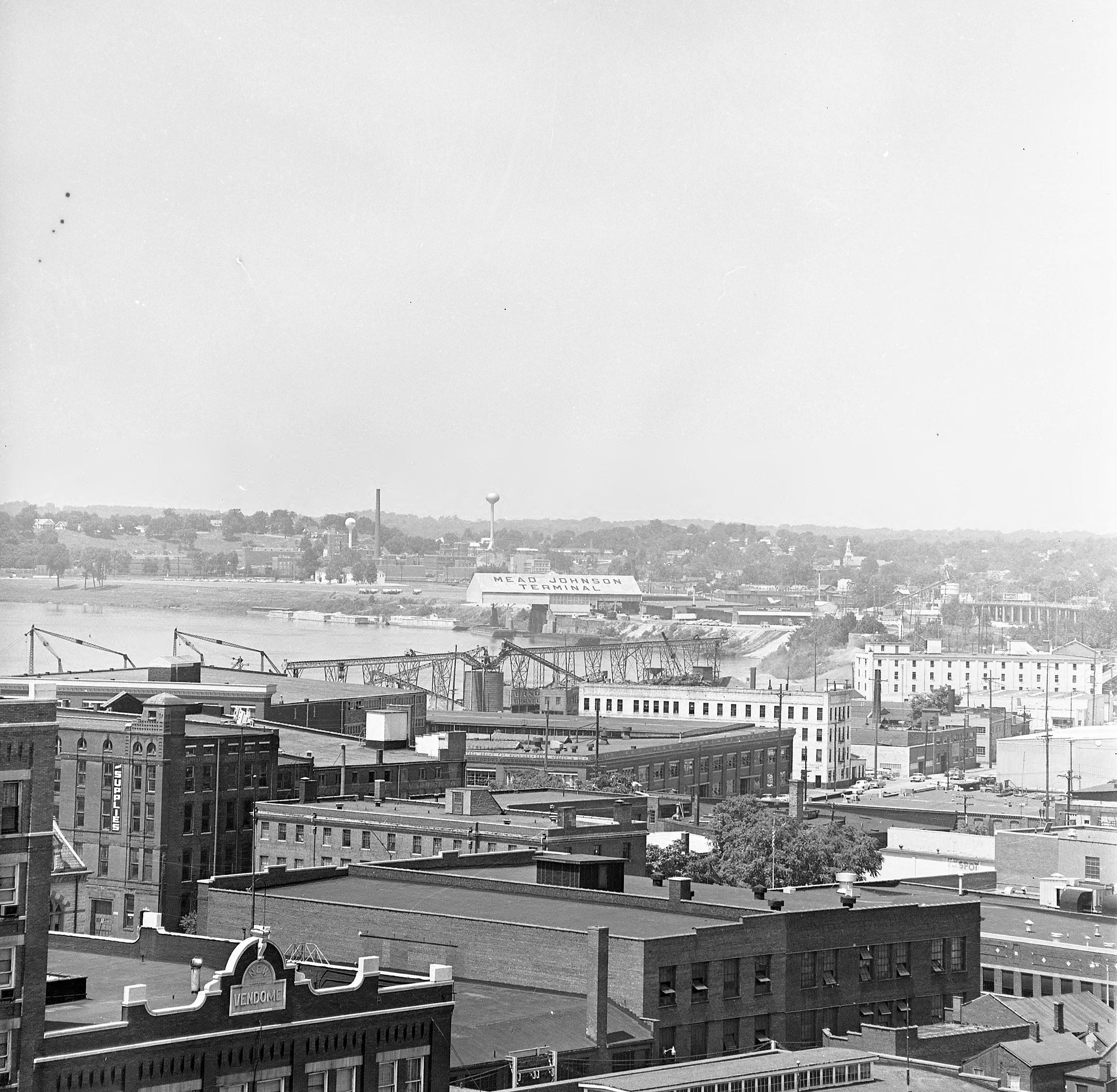 Elevated of downtown Evansville, taken from a rooftop at 3rd St. and Main St., looking west towards Mead Johnson Terminal on the Ohio River. Left foreground is the Hotel Vendome at 24-30 NW 3rd St. The Mead Johnson terminal was at 1830 W. Ohio St.