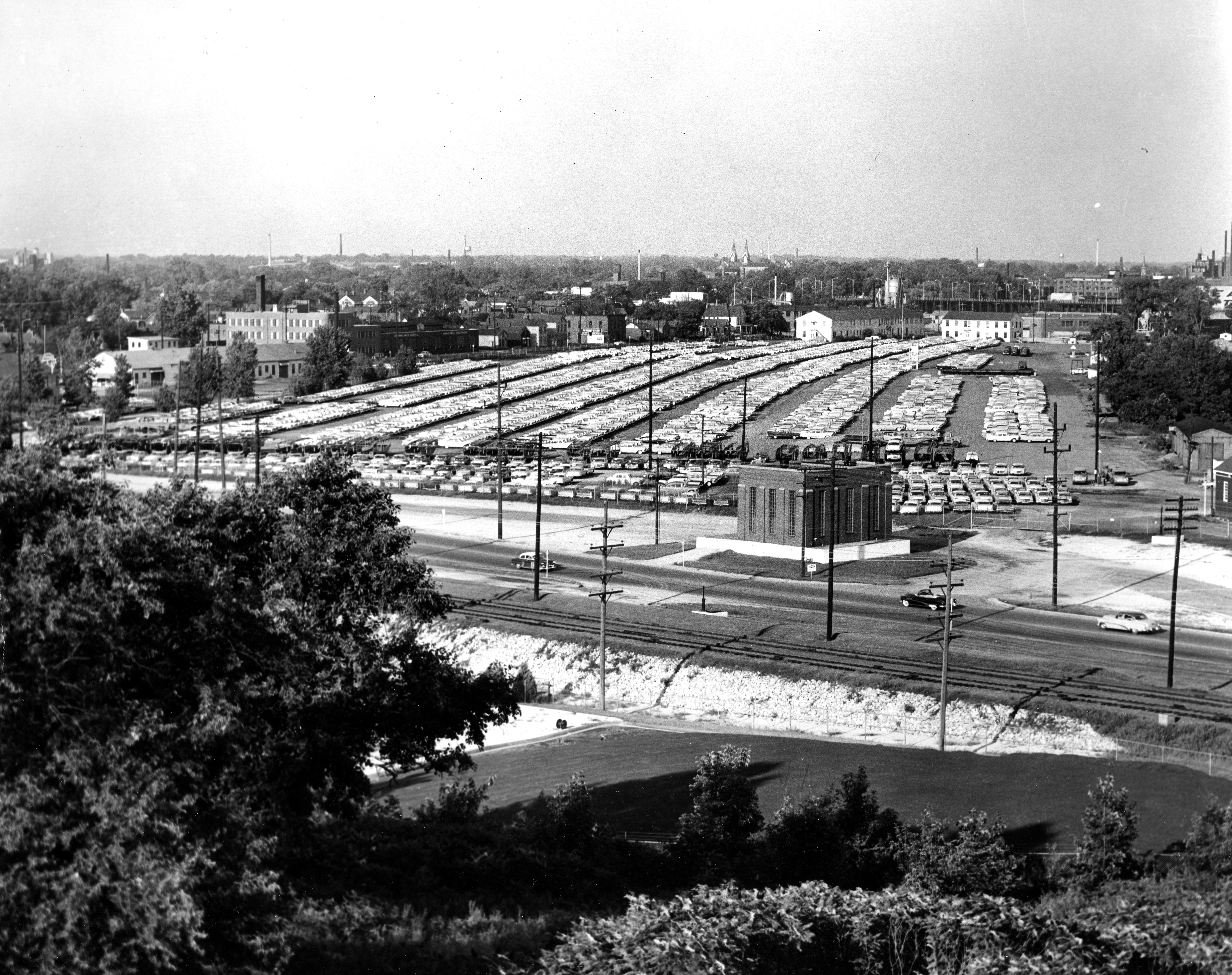 Chrysler Corporation's parking lot--assembly plant at 1625 N. Garvin St., body plant at 820 E. Columbia St. The Graham Brothers Truck Company opened in 1919, was purchased by Dodge in 1925, and then by Chrysler in 1928. It closed circa 1959. During WWII, this Chrysler plant manufactured 96% of the military's .45 caliber ammunition. The contract to do was signed February 18, 1942, and refitting the automobile assembly plant to an arsenal began immediately, with the first bullets produced test fired June 30, 1942.