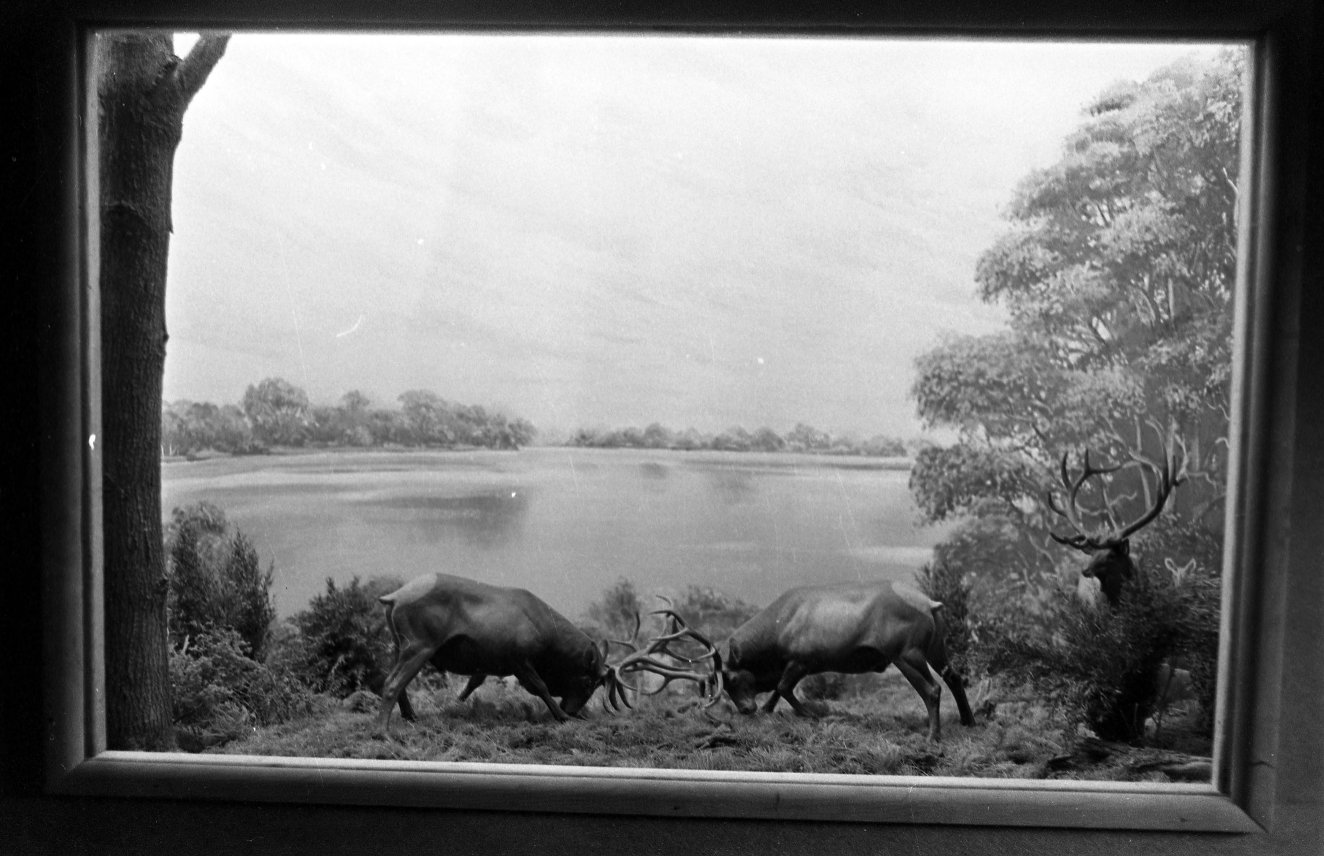 Painting of stags fighting alongside a body of water.