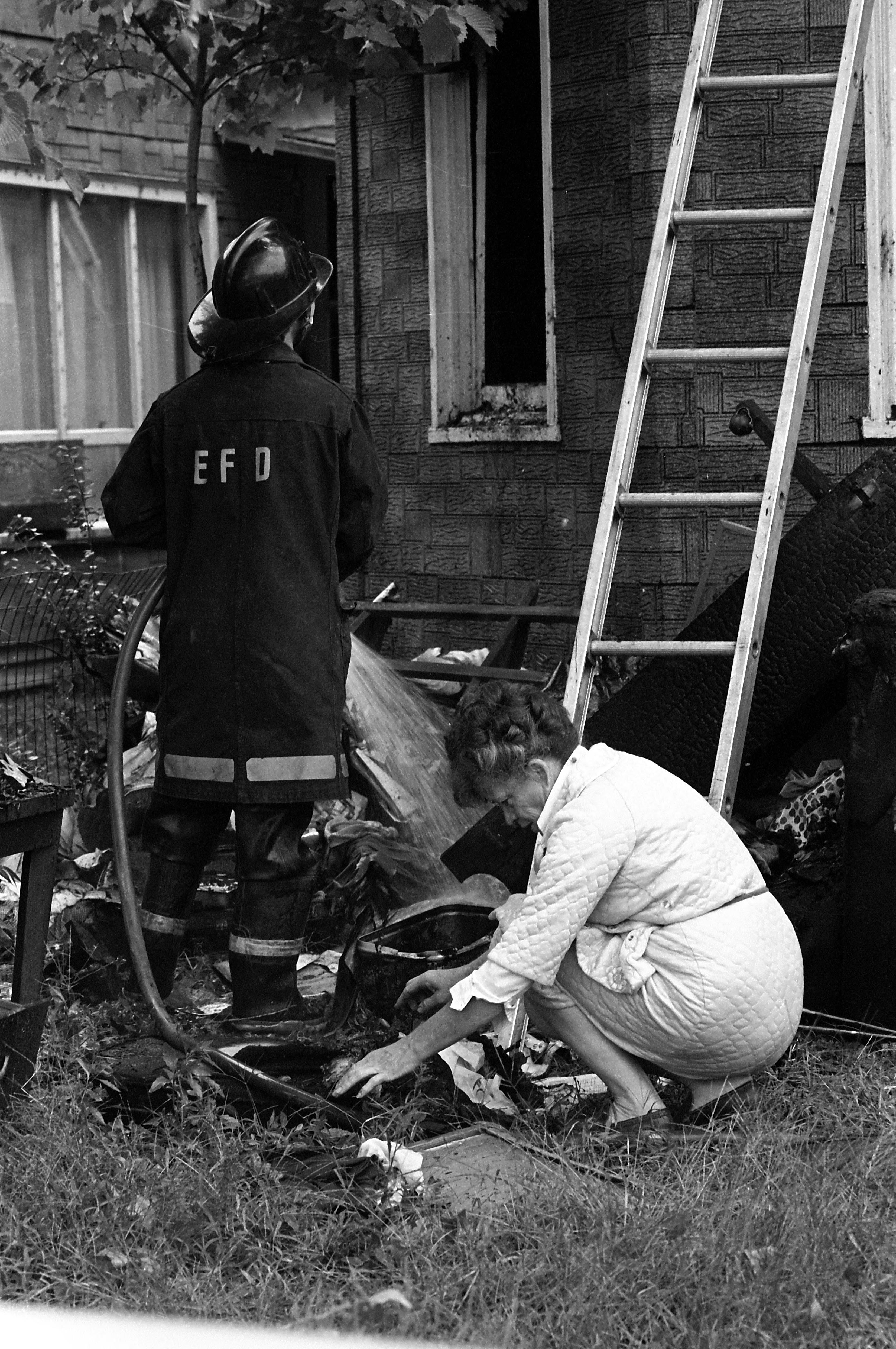 An Evansville Fire Department officer looks up at a house that has been on fire. A woman (house owner?) squats on the ground behind him, looking at salvaged ") items. A ladder leans against the house. (SEE ALSO MSS 034-0032)