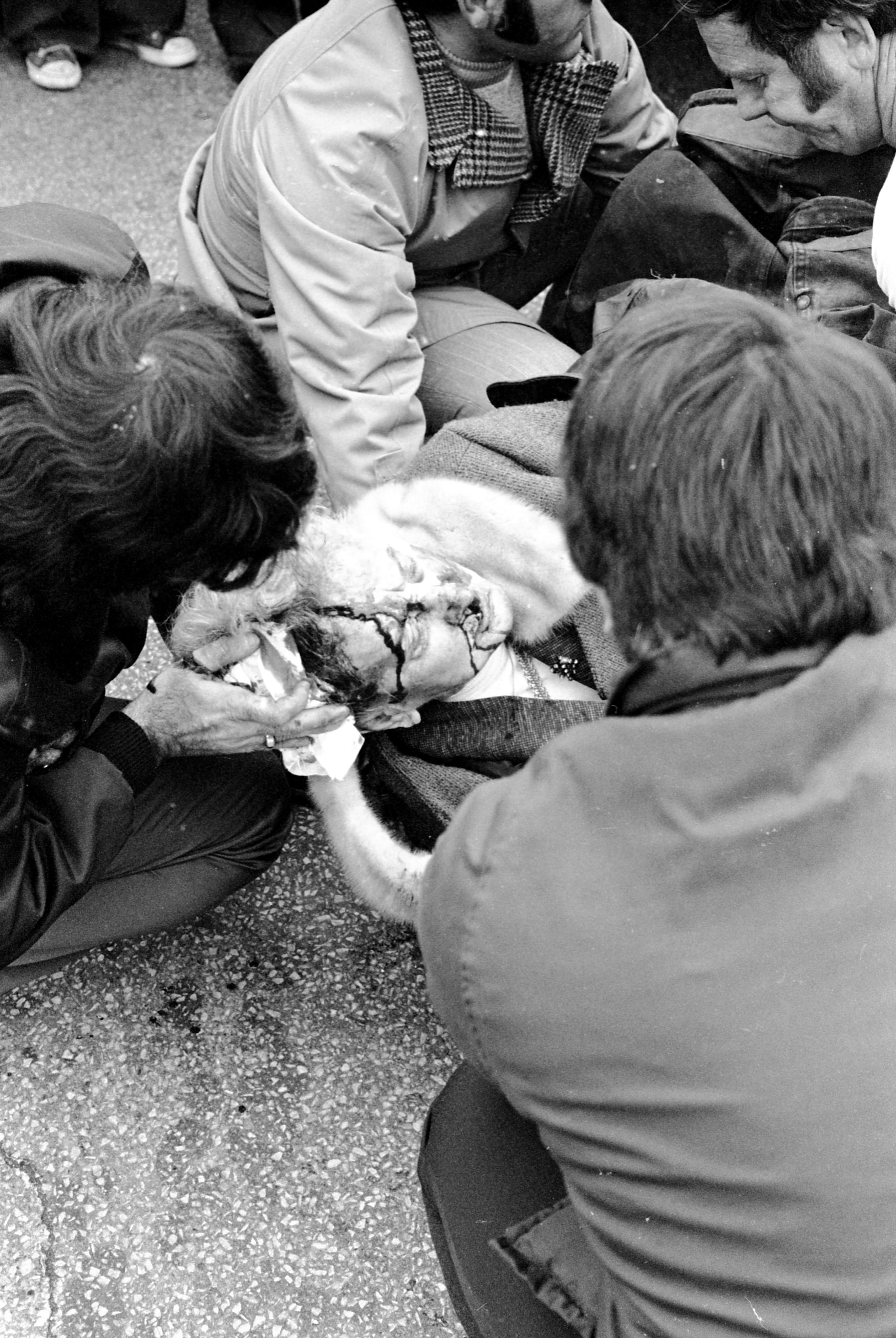 Car accident victim laying on the ground, with head and face wounds, being supported by witnesses