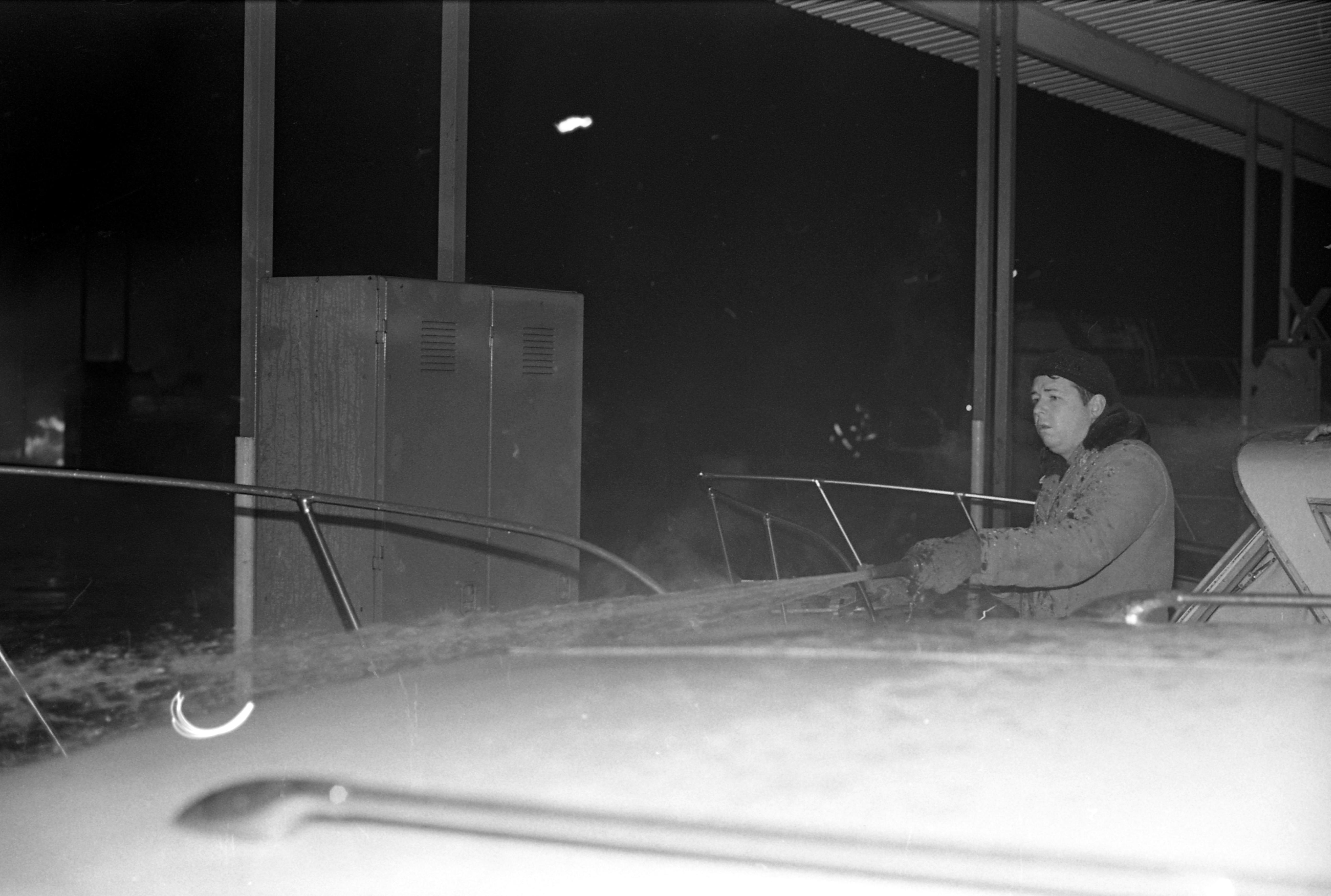 Man with fire hose spraying a boat that apparently was on fire, or is spraying it down to protect it. The boat is under a shelter of some kind. The December 23, 1975 fire at Inland Marina on Waterworks Rd. left an estimated $850,000 worth of pleasure boats in ruin.