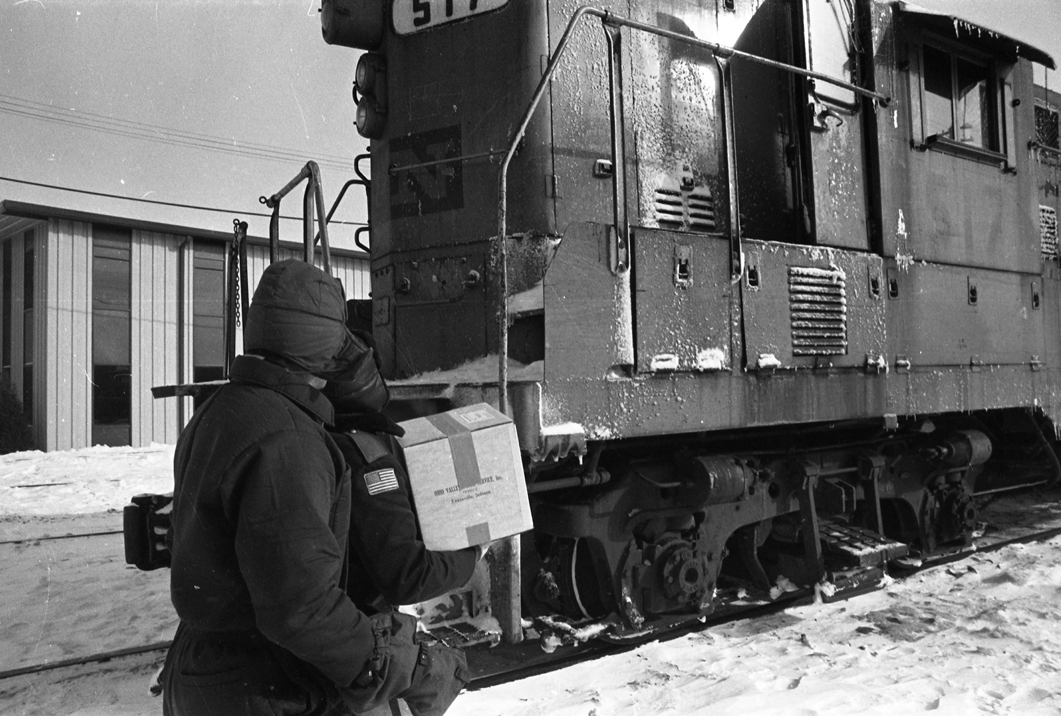 Sheriff's department officer delivering a box of human blood from Ohio Valley Blood Services Inc. at 123 SE 2nd St. to a train during the blizzard of 1978. On 1/17/78 there were 16 inches of snow on the ground, with 7 still left on 1/25. That day 4 more inches fell, and winds of 51 mph caused 8 ft. drifts and whiteout conditions, with a wind chill of 50 degrees below zero. People were trapped in their cars or at work if they weren't home, and businesses closed for 2 days. Some 80 people died in 16 states.