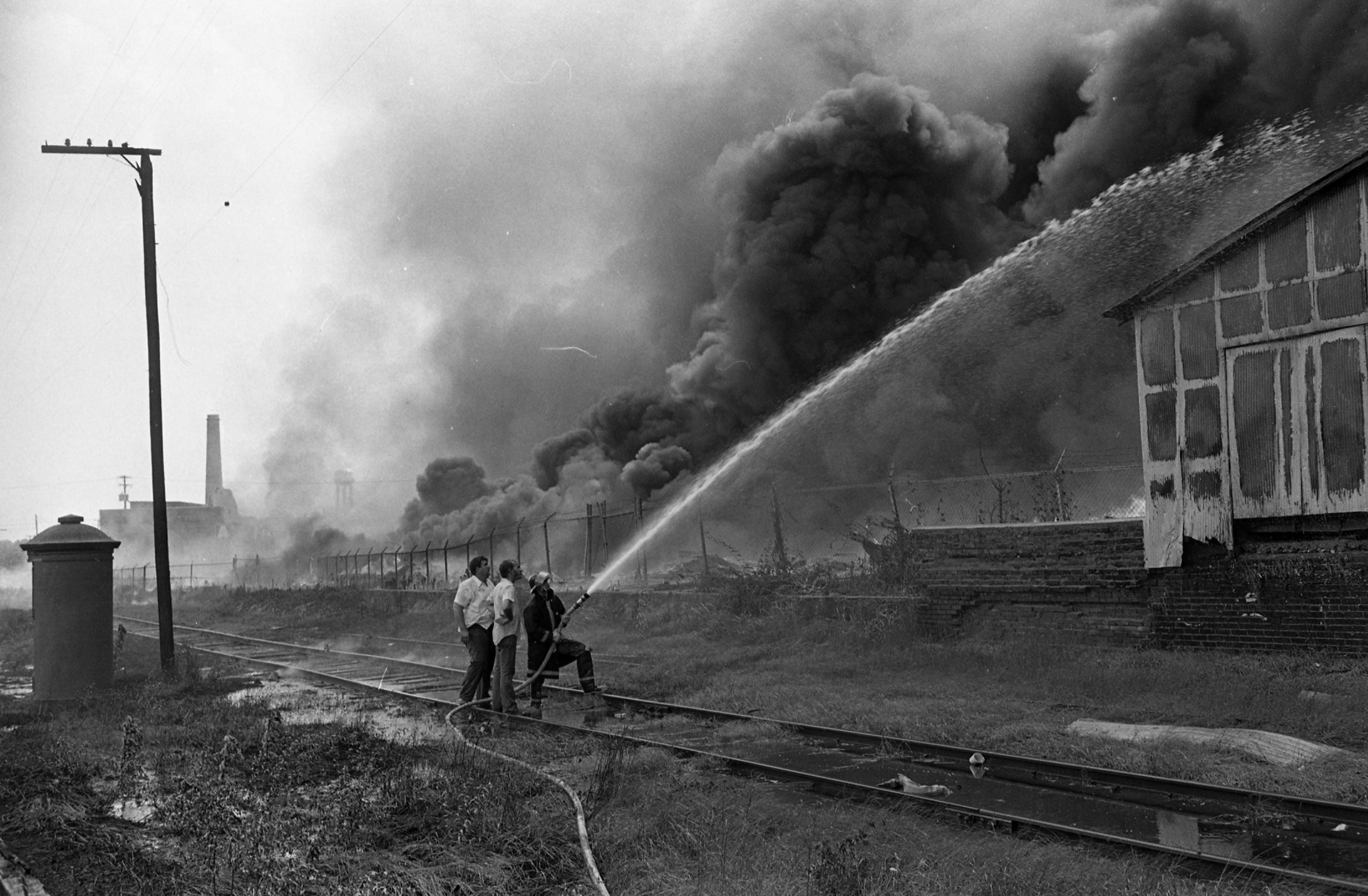 This fire began in the Atlas Tack building at the corner of O'Byrne and Atkinson St." then was blown across O'Byrne St. into an open field full of tires, and from there debris from the tires blew it back into warehouses at the corner of Clay and Atkinson St.. It also ignited some small grass fires by the L&N tracks east of Atlas Tack, which is probably where this firefighter is working from.