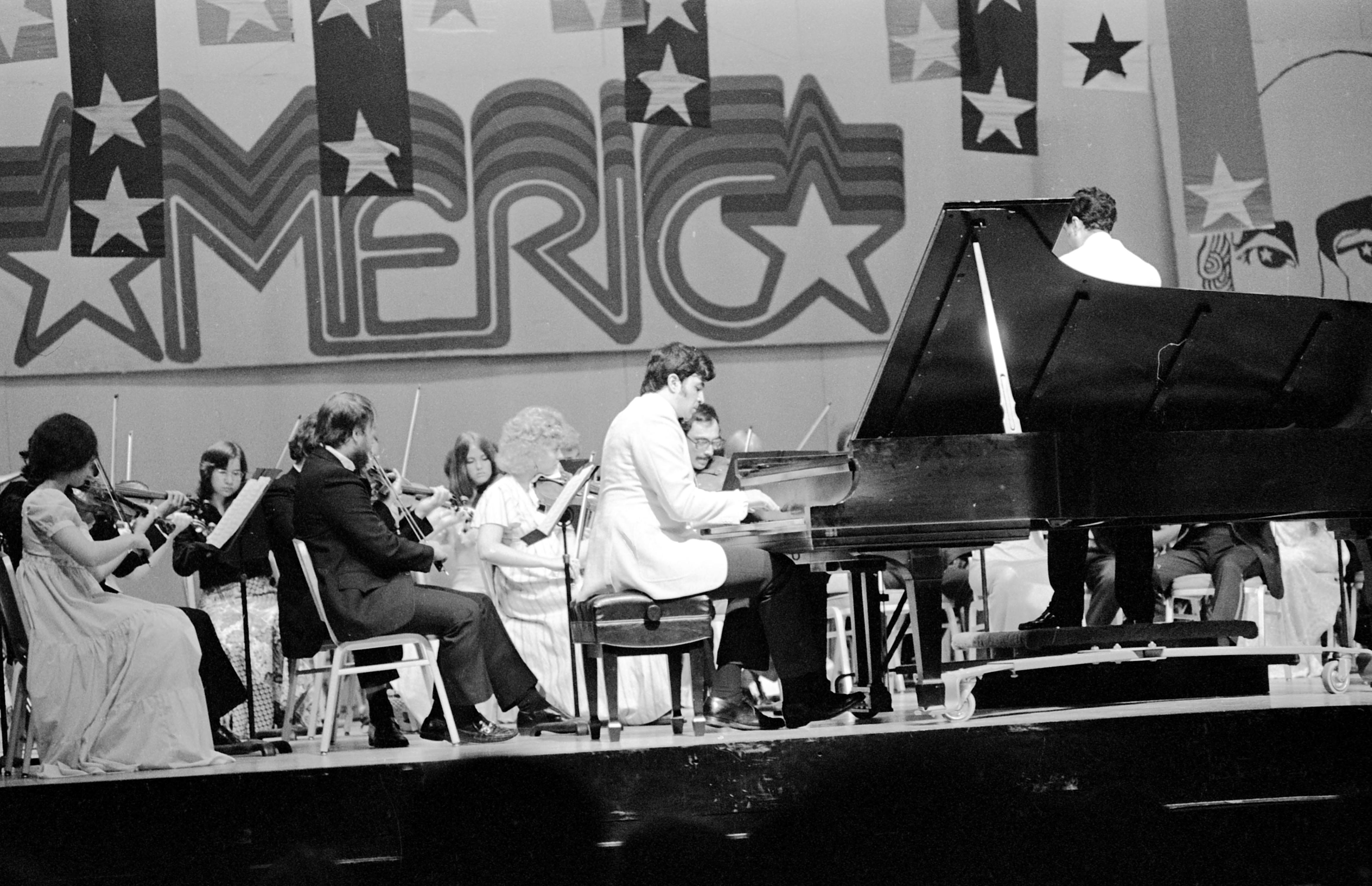 Given the backdrop, this is thought to be a Bicentennial Pops Concert at Vanderburgh Auditorium (715 Locust St.; the building no longer exists). If correct, then this is Gregory Davis in concert with the Evansville Philharmonic Orchestra. At the time of this photograph, the maestro was Minas Christian, although it is unknown whether or not this is him at the podium.