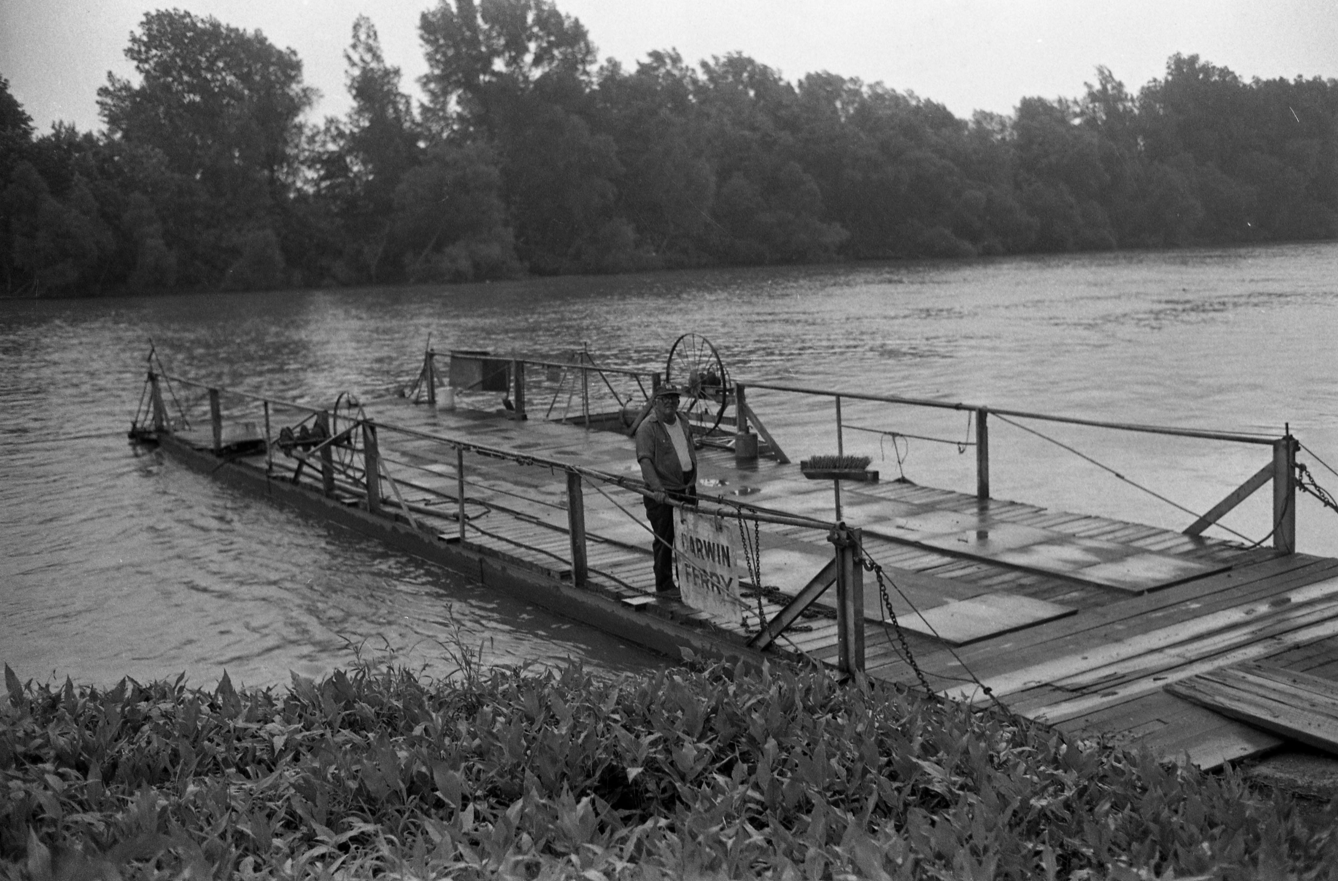 This ferry crosses the Wabash River between Darwin, IL and Indiana, at river mile marker 165. This is north of Vincennes on the Indiana side. In this photo, the operator awaits customers.