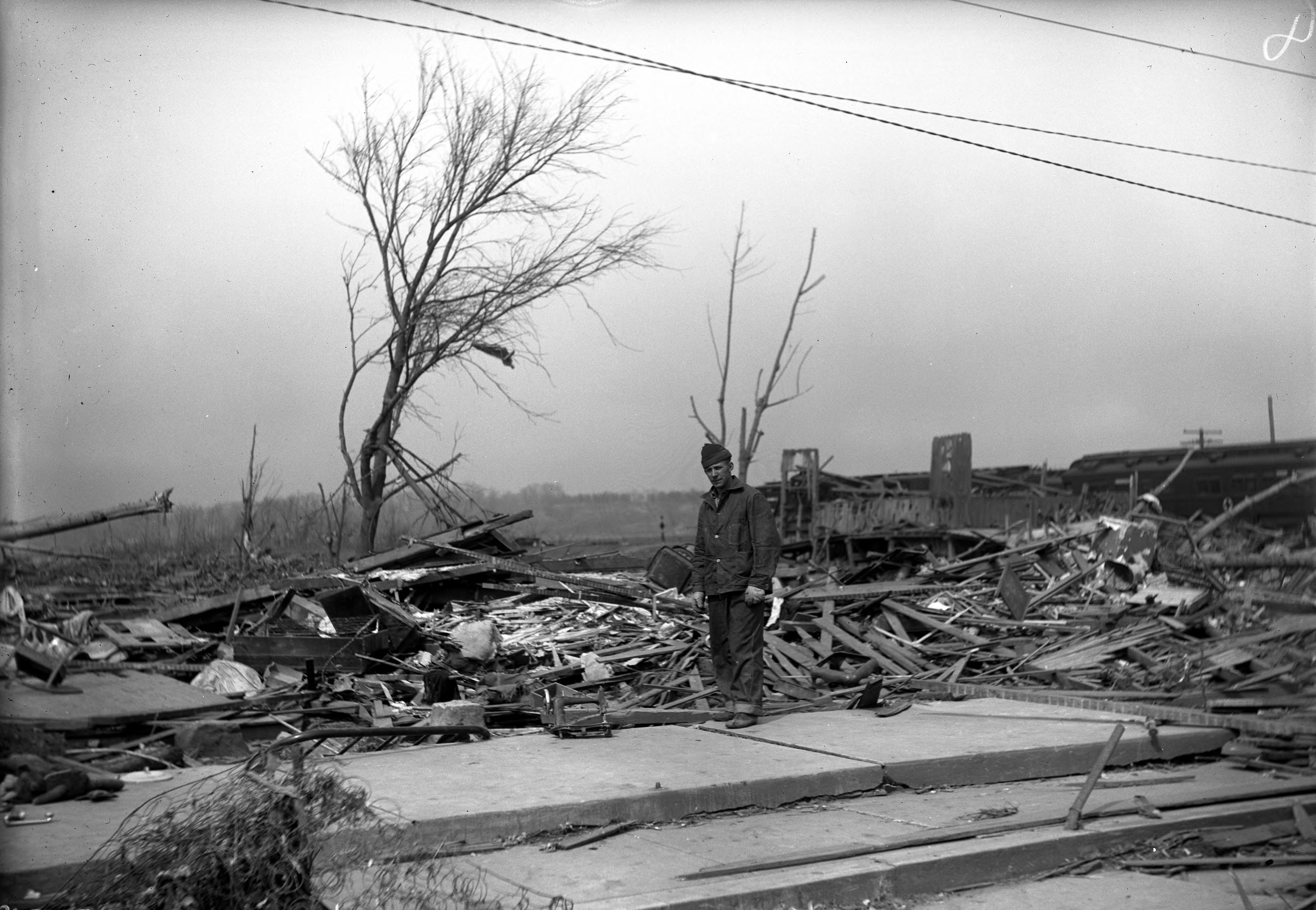 Herbert Stalling's home destroyed by tornado.""On Wednesday, March 18, 1925, the longest and deadliest tornado in U.S. history stuck the Midwest. Called the Great Tri-State Tornado, it started at 1:01 p.m. around Ellington, Missouri. It raged for three and a half hours, barreling through southern Illinois and Indiana before finally breaking up after hitting Princeton, Indiana. The 219 mile devastation path included three states, 19 communities, destroyed more than 15,000 homes, injured 2,027 people and leaving 695 dead."" After three and a half hours and 219 miles of destruction, the Tri-State Tornado, the longest and deadliest in the United States, finally began to dissipate 10 miles northeast of Princeton. It left an estimated $16.5 million ($1.5 billion today) in damages. Even worse though was the number of casualties. In southern Illinois alone: 541 were killed while 1,423 were injuried in 40 minutes when the storm blew through Murphysboro, De Soto, Hurst-Bush and West Frankfort. It killed 69 children in nine schools. The Red Cross and National Guards were called in to help in the recovery and cleanup."" De Soto, Gorham and Griffin, Indiana were also virtually annihilated by the Tri-State Tornado. In Griffin, between 69-75 people were killed and 85 farms were destroyed." (http://www.historybyzim.com/2013/07/tri-state-tornado/).