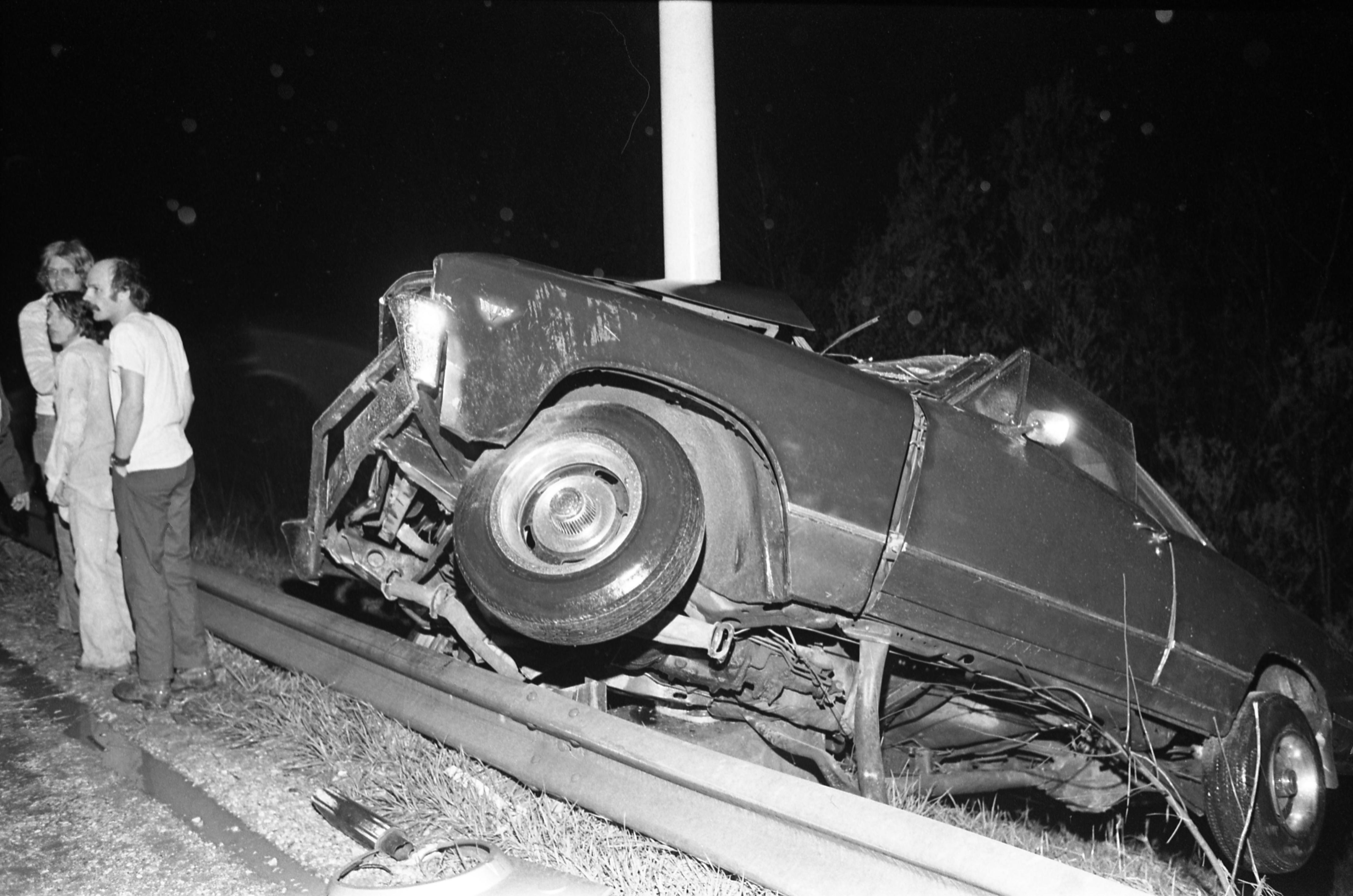 Taken from the other side, close-up of a wrecked car, smashed into a utility pole and partially atop the guardrail