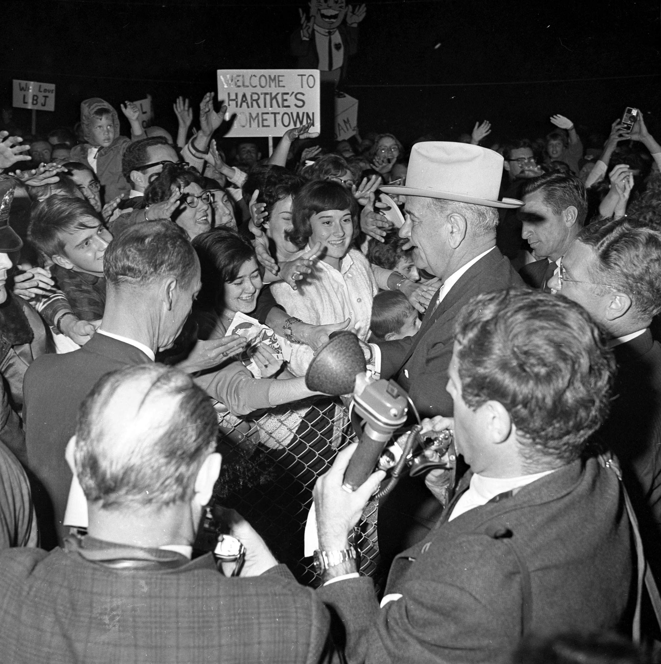 Lyndon Baines Johnson was in Evansville October 27, 1964, joining his wife to campaign for his election of as U.S. president. Behind him is the United States Senator from Indiana, Vance Hartke. Here they are greeting supporters at the airport.
