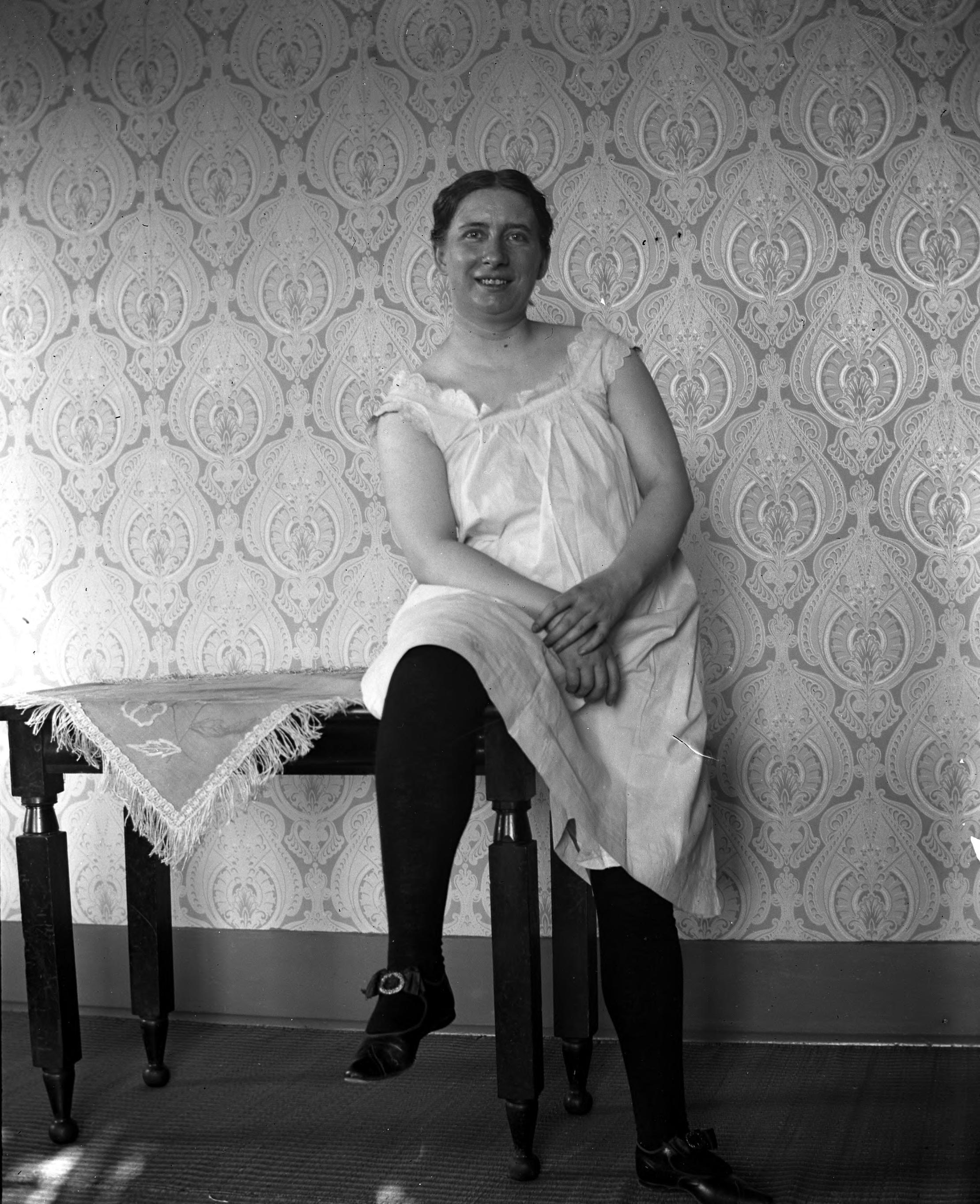 Maud Miller Fauntleroy, taken in room no. 22 in Harmonist Tavern on Church St. She is posing in her shift. Maud Miller Fauntleroy was the wife of the Homer Fauntleroy seen elsewhere in this photographic collection.