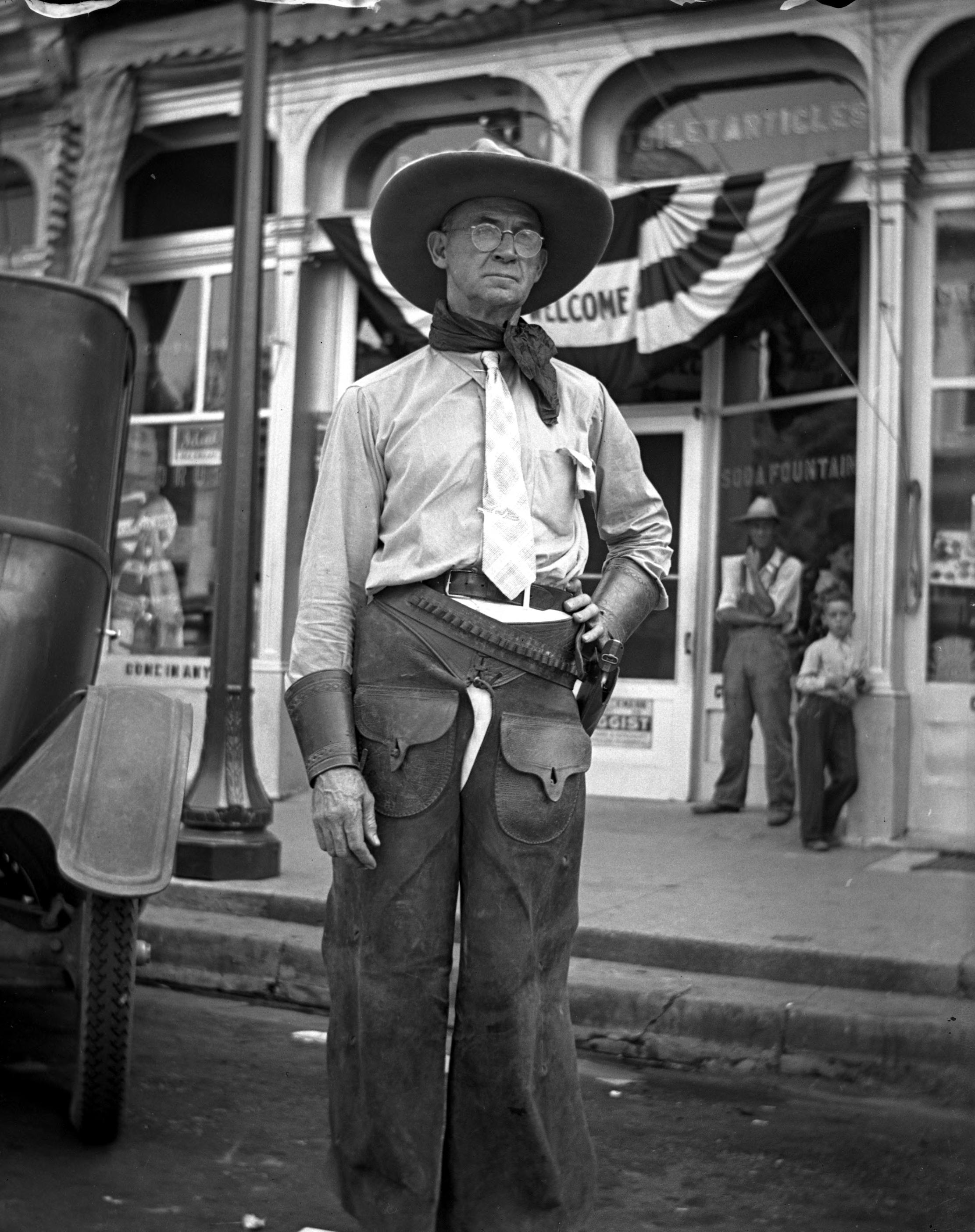 Mr. Heckman in cowboy costume. He is standing in front of a store that contained a soda fountain, and there is a welcome banner over the store.