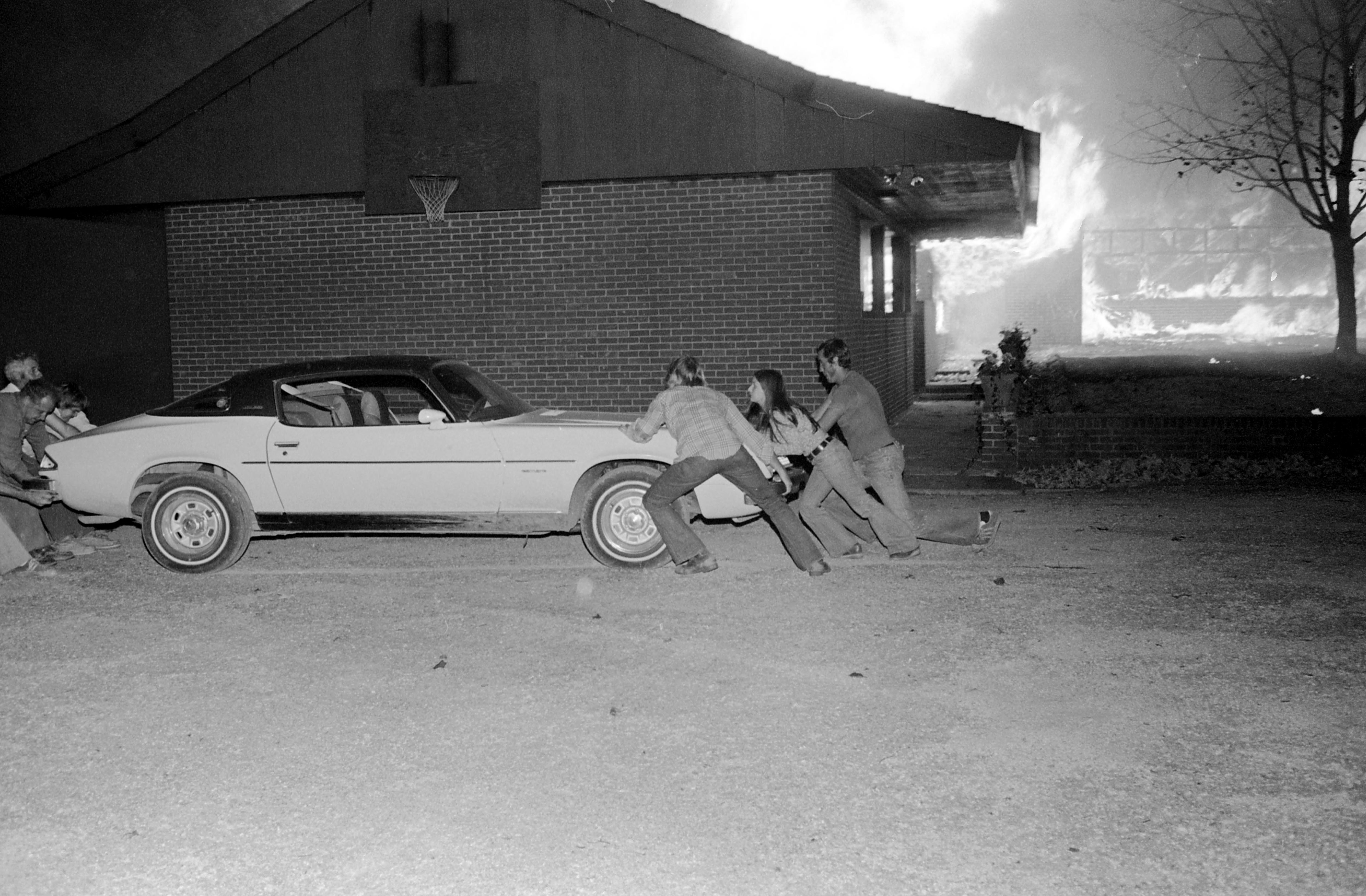 People attempting to push an automobile away from a house that is either next to a house on fire, or possibly also on fire itself.