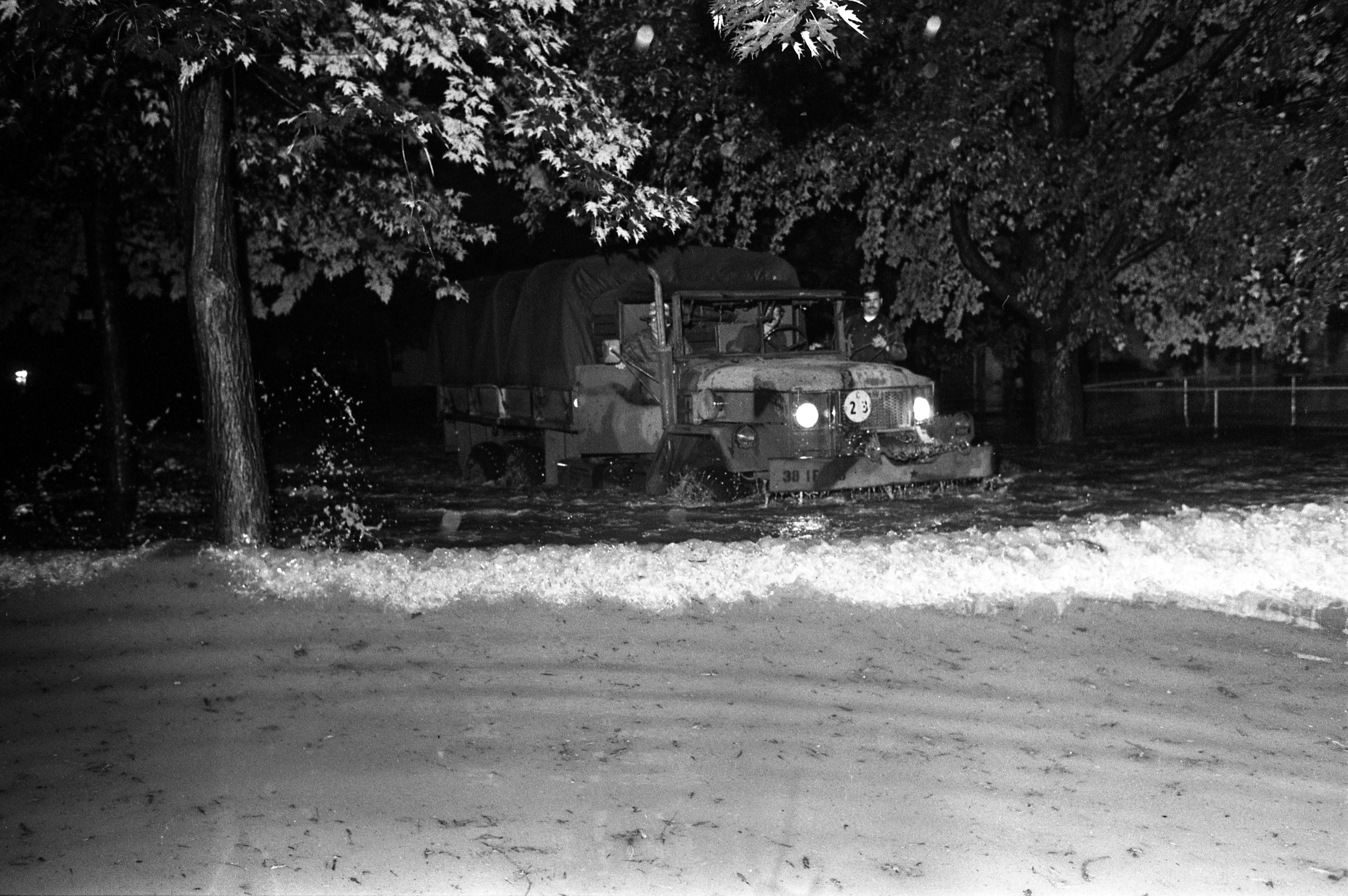 This photograph depicts the rescue of 83 year old Mrs. Myrtle Grubb from her porch on the south side of Princeton, IN by Gibson County sheriff's deputy Nick Michas. She is in the back of this truck. Torrential rains brought 8.9 inches of rain to Princeton over a 48 hour period, and 14.9 inches to English and Marengo, other small southern Indiana towns, causing rapid flooding. Up to 11 counties were considered disaster areas.