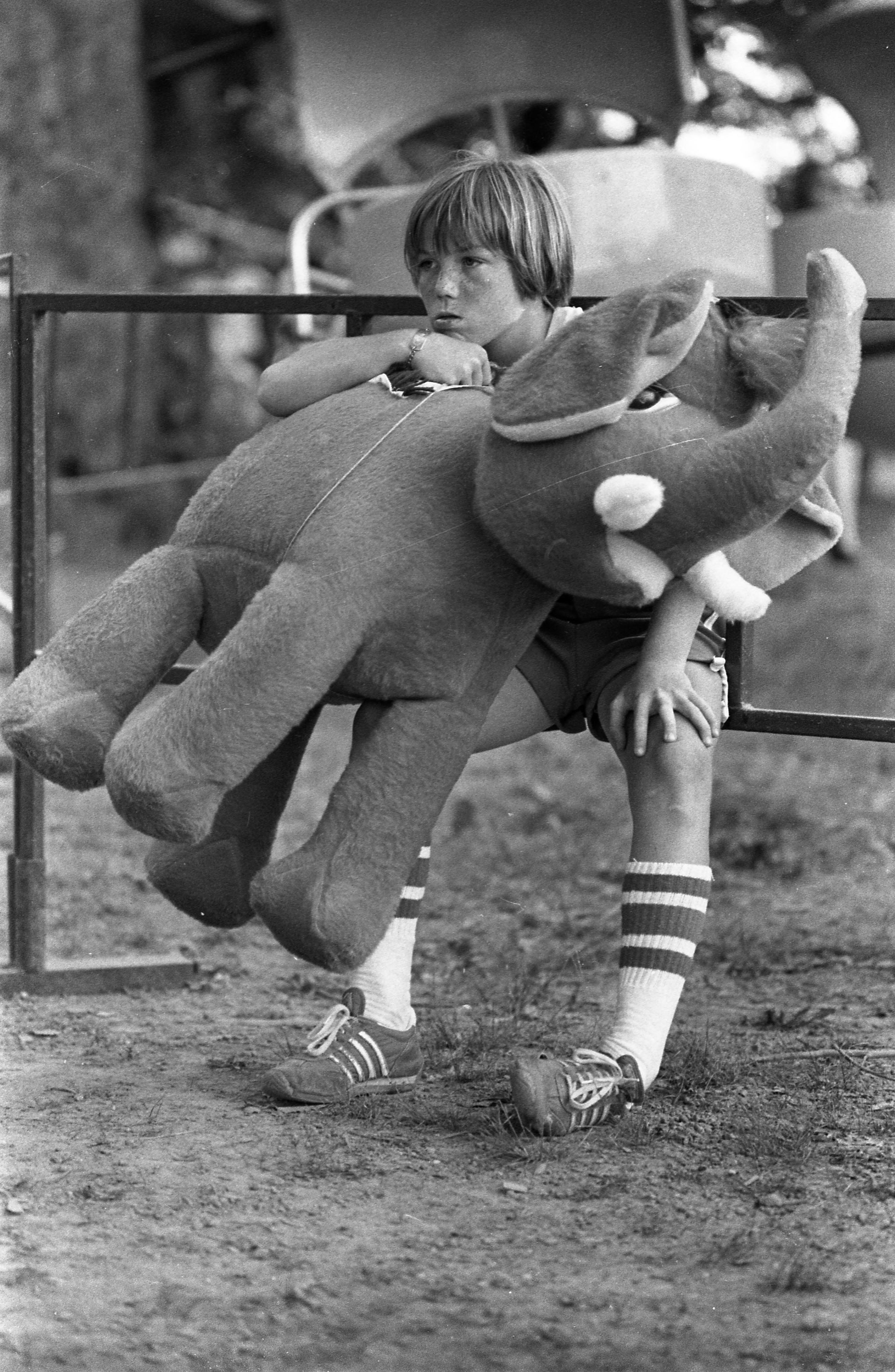 Young boy sits on a fence, possibly at a county fair, holding a large stuffed elephant nearly his size